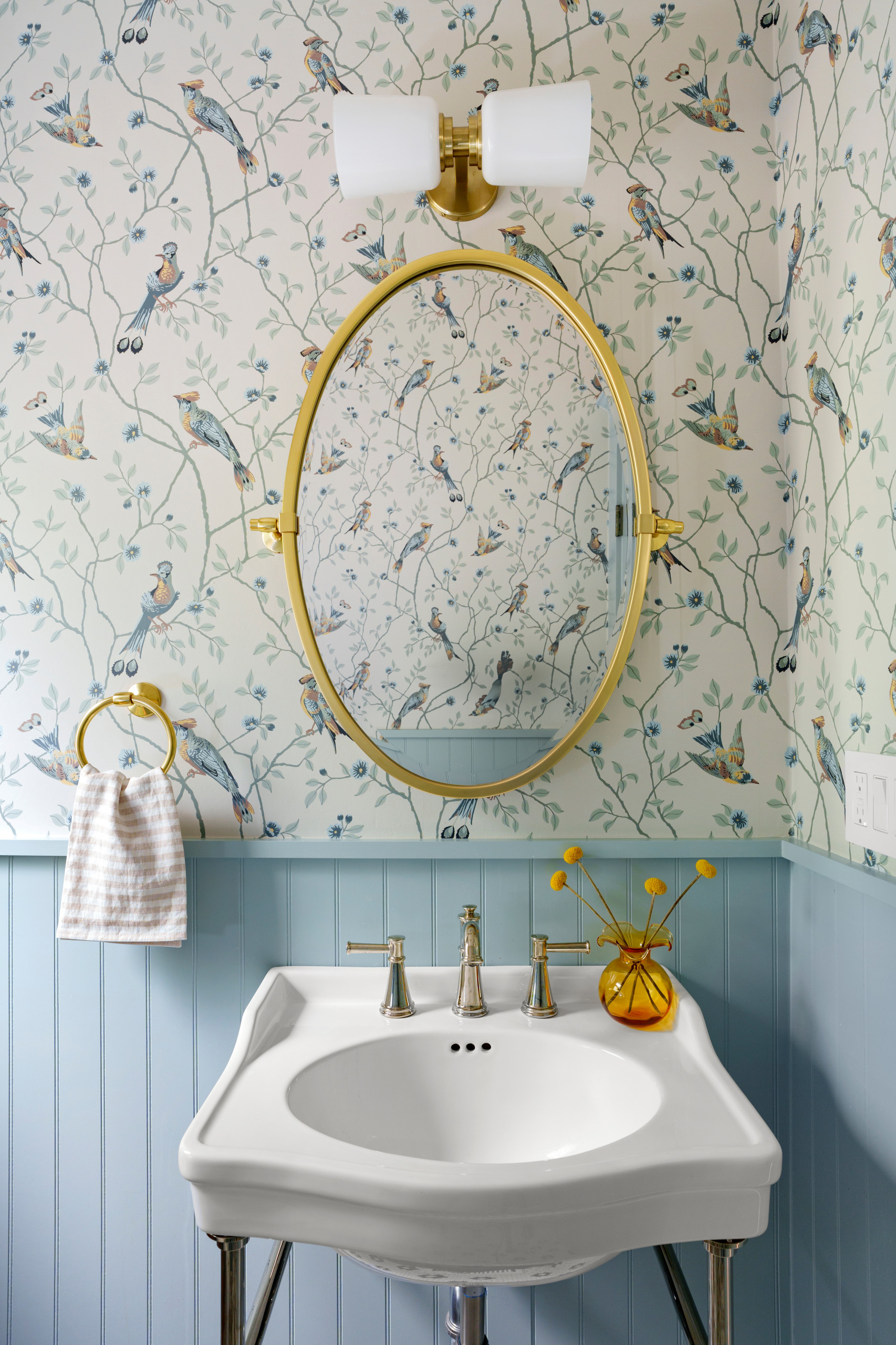 Designed by Along Came Lennox, this charming, traditional-style San Francisco powder room looks like an indoor garden — or perhaps a hand-painted teacup with a gold rim. Exotic birds perch on delicate branches on the Sandberg wallpaper, which stretches above wainscoting painted the color of a cloudless sky.