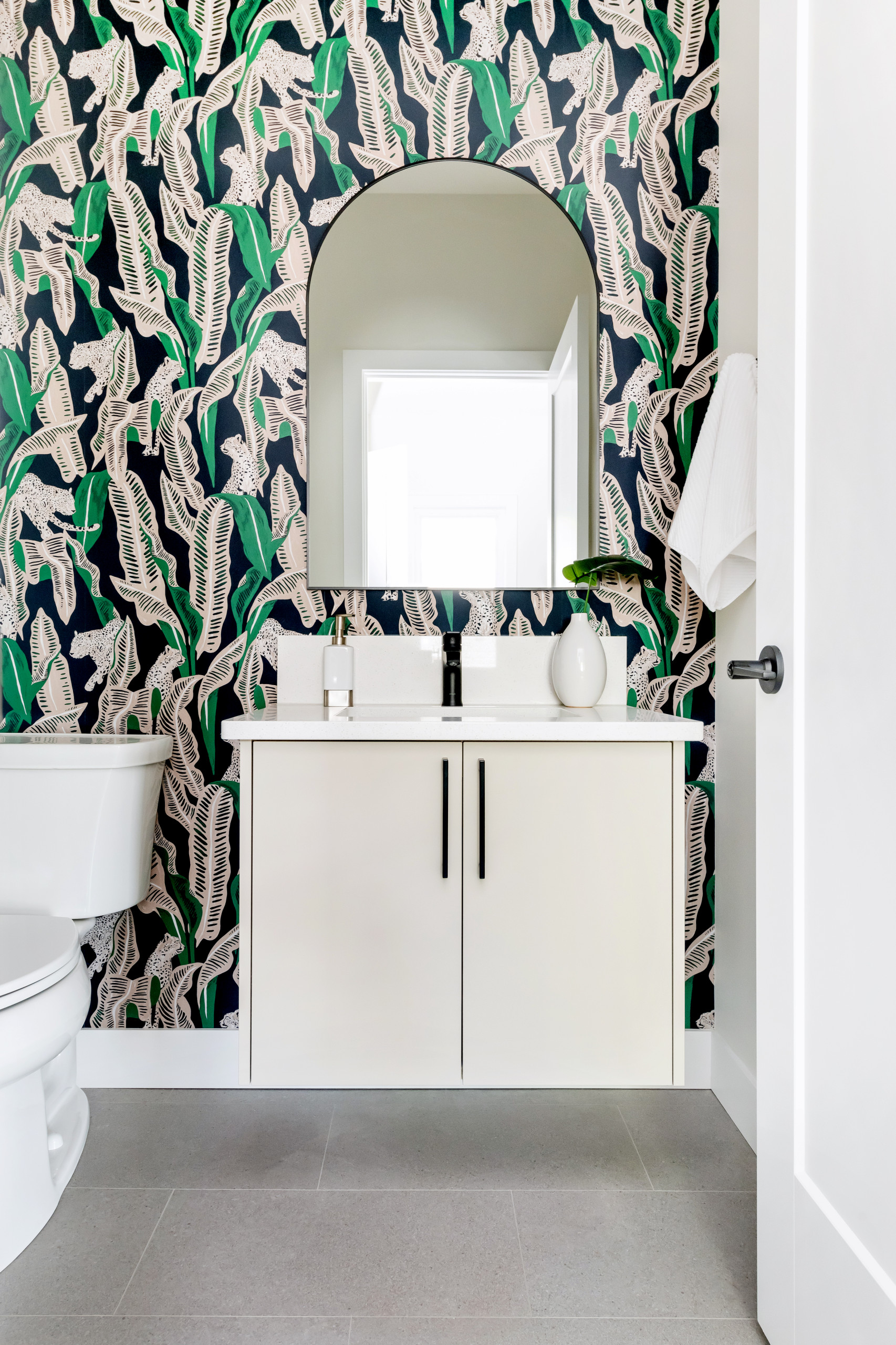 In a Saskatchewan powder room uploaded by Bella Vista Developments, prowling jaguars seek camouflage amid tropical leaves. A clean white wall-hung vanity and arched mirror let the wild Masureel wallpaper provide all the excitement.