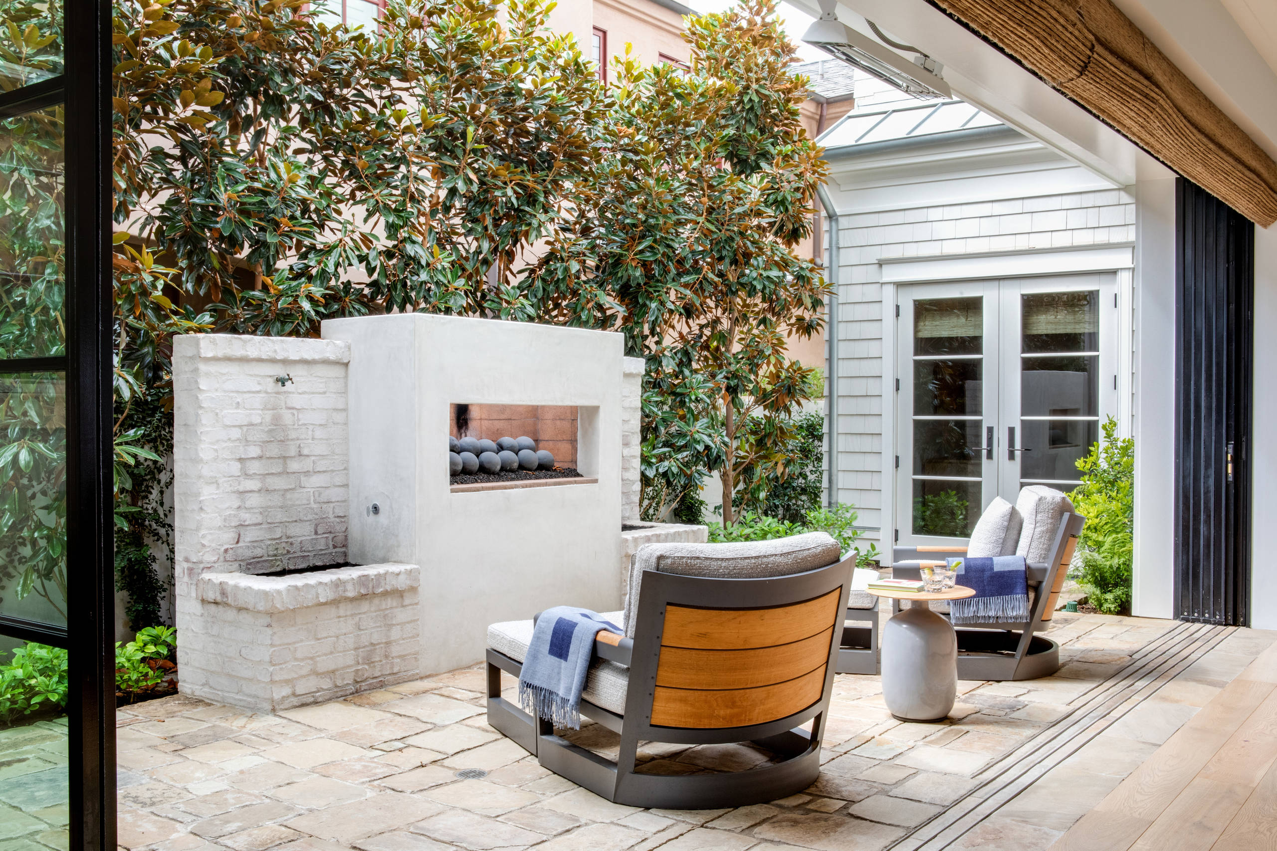 This small patio fronting a brick fireplace is the perfect spot for relaxing with family, friends and neighbors on a chilly evening. It’s conveniently tucked around the corner from the Los Angeles home’s front entry. A mix of traditional bricks and vertical siding teamed with contemporary square concrete pavers and horizontal wood accents creates a timeless appeal.