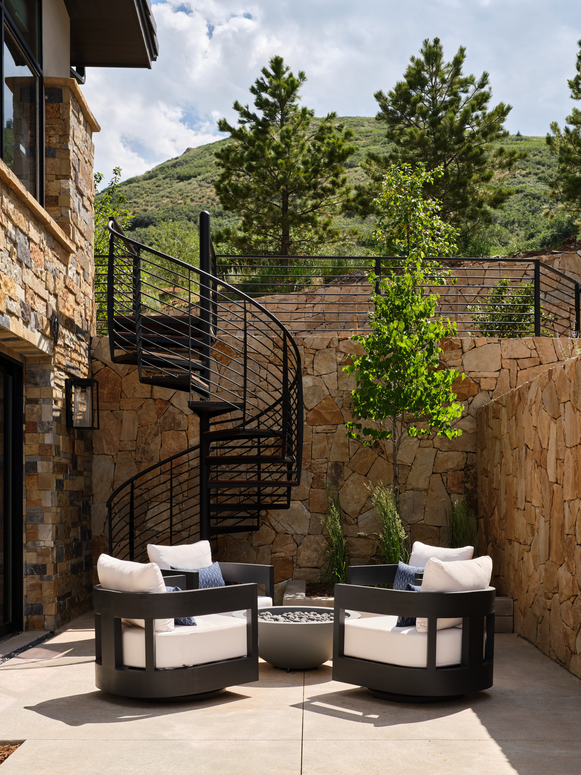 Stone walls, a spiral staircase and smooth pavers bring old-world Tuscan style to this small patio in Littleton, Colorado. The modern fire bowl and chairs add a pleasing contrast and allow the homeowners to relax and enjoy the mountain views beyond.