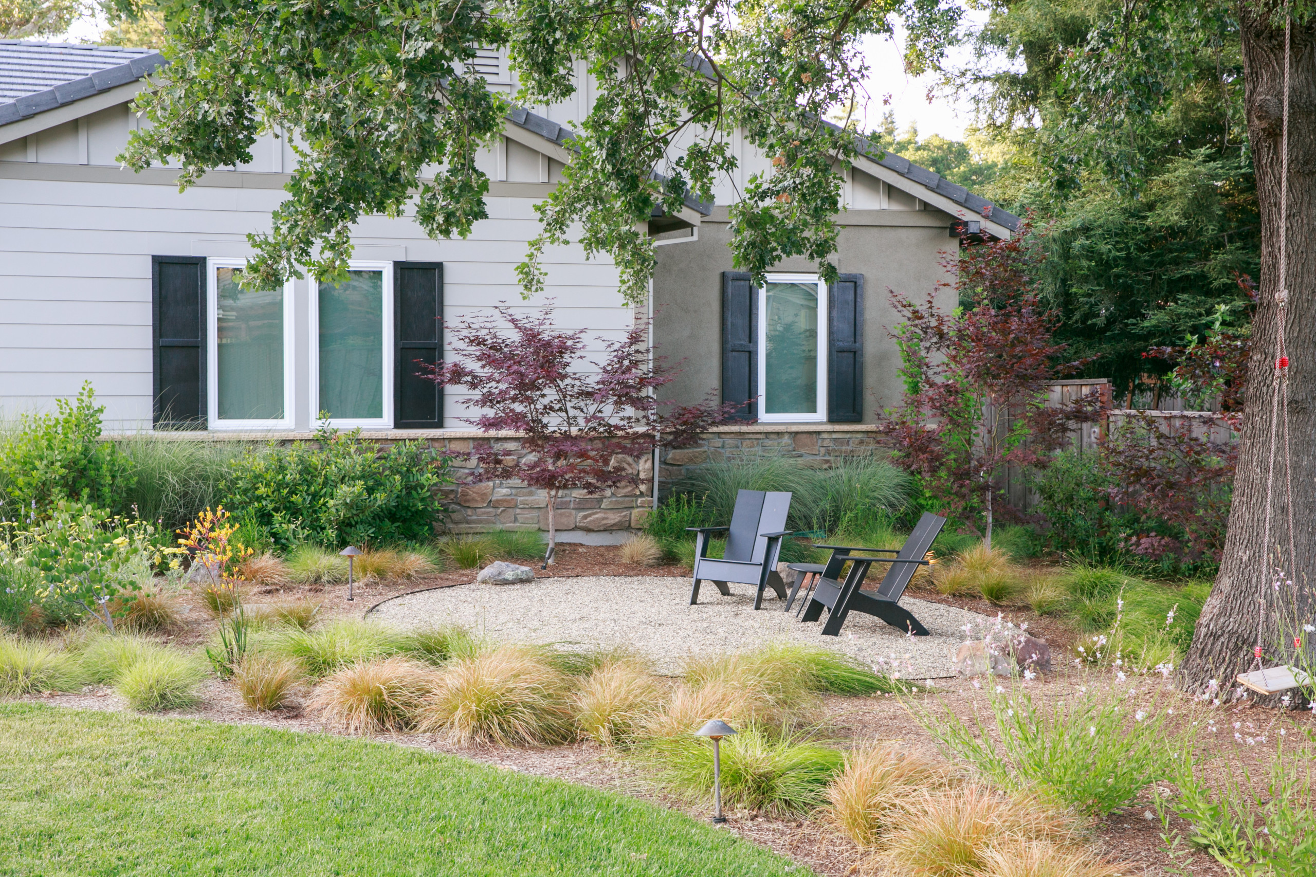 The designers chose soft grasses and climate-friendly perennials and trees to set off this gravel patio in the San Francisco Bay Area to its best advantage. The casual look feels right at home in the space, softening it without being overwhelming.