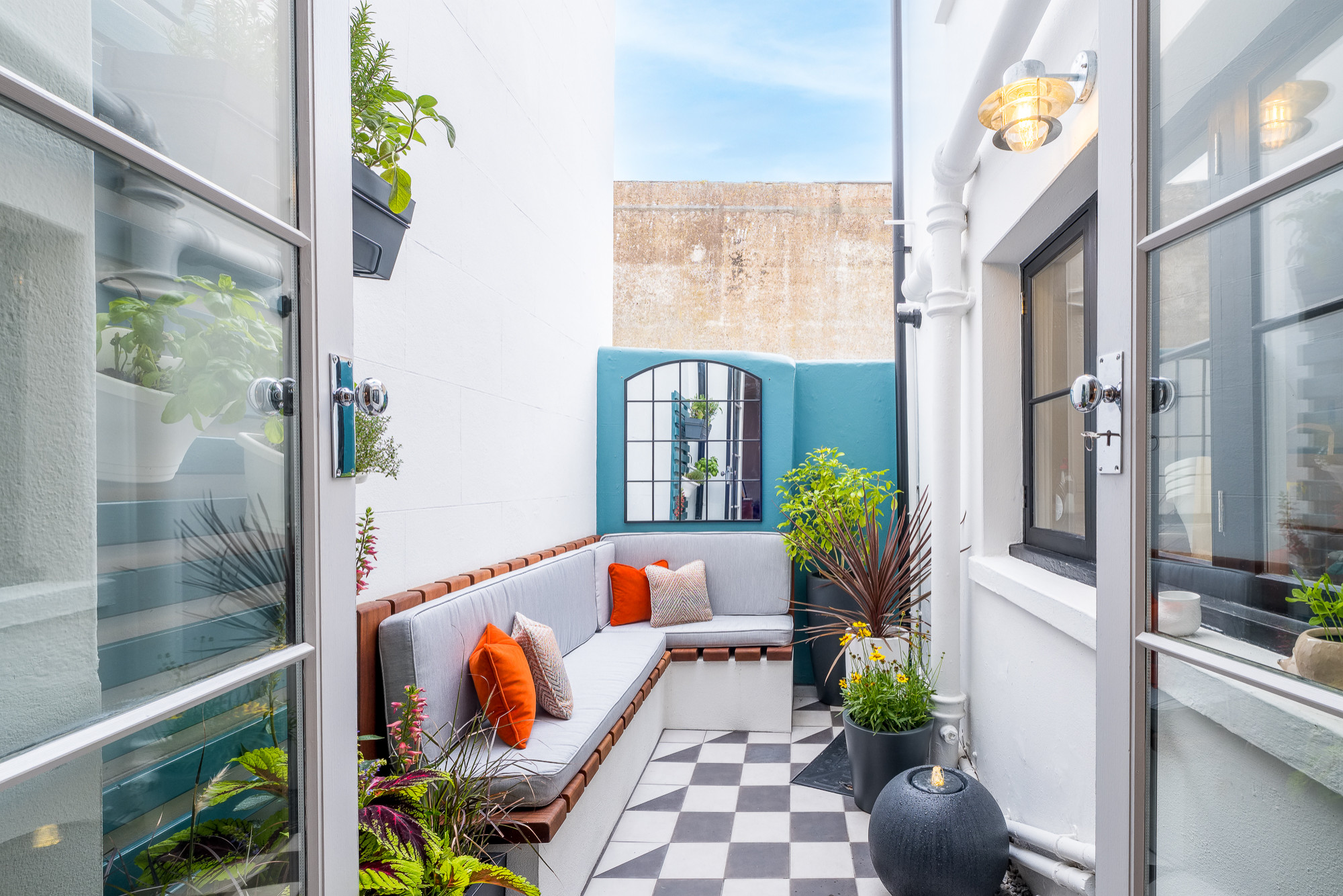 The narrow outdoor space at this Sussex, England, townhouse packs in a lot of style and functionality. A mirror on a bright blue wall at one end acts as a striking focal point and visually expands the space. A built-in L-shaped bench provides plenty of seating, with lush plants along each side wall softening the look.
