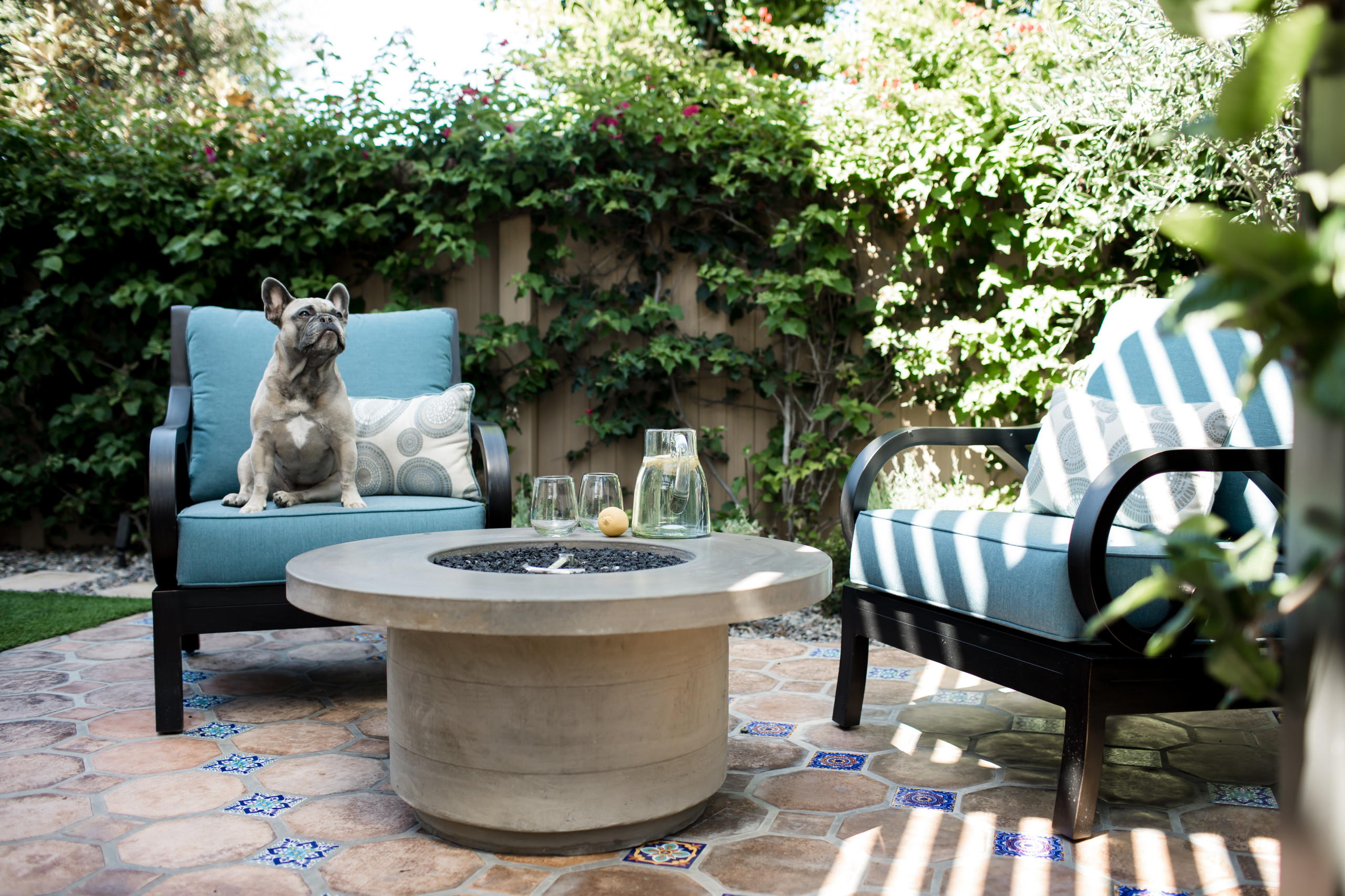 The mix of adobe and blue tiles on this patio in San Juan Capistrano, California, reflects the town’s Spanish influence. A contemporary fire pit and armchairs with comfy cushions — just right for both humans and pets — subtly update the style.