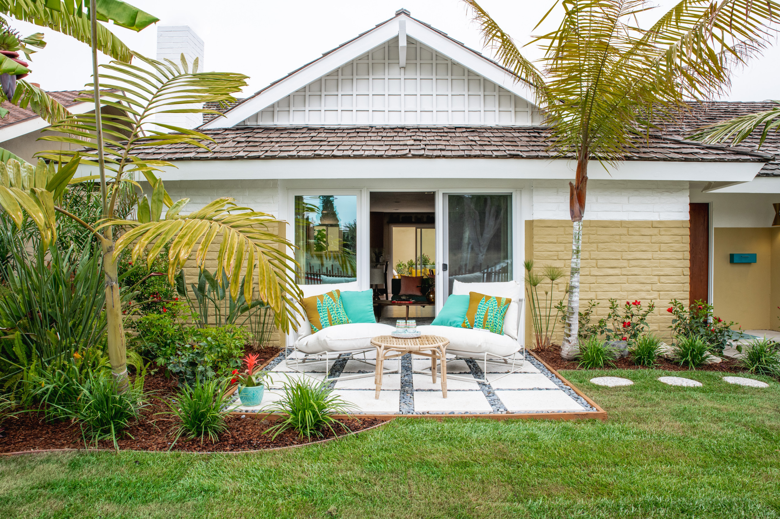 Tropical design, tiki accents and midcentury modern style were the inspiration for this Orange County, California, home. The entry patio, just to the left of the front door and connected to the living room, sets the tone for the space, blending palm trees and tropical plants with retro lounge chairs.