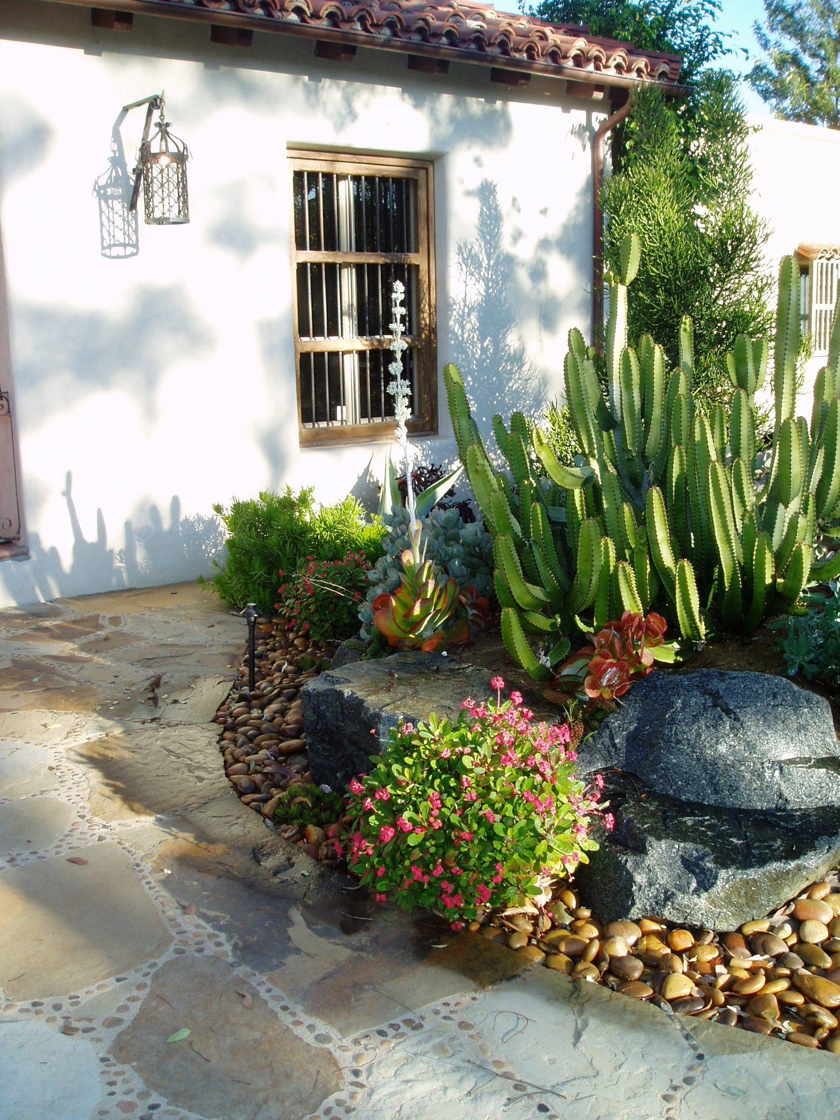 Succulents just seem to go with Spanish houses. In addition to beautiful color and texture, succulents are drought tolerant and easy to maintain.