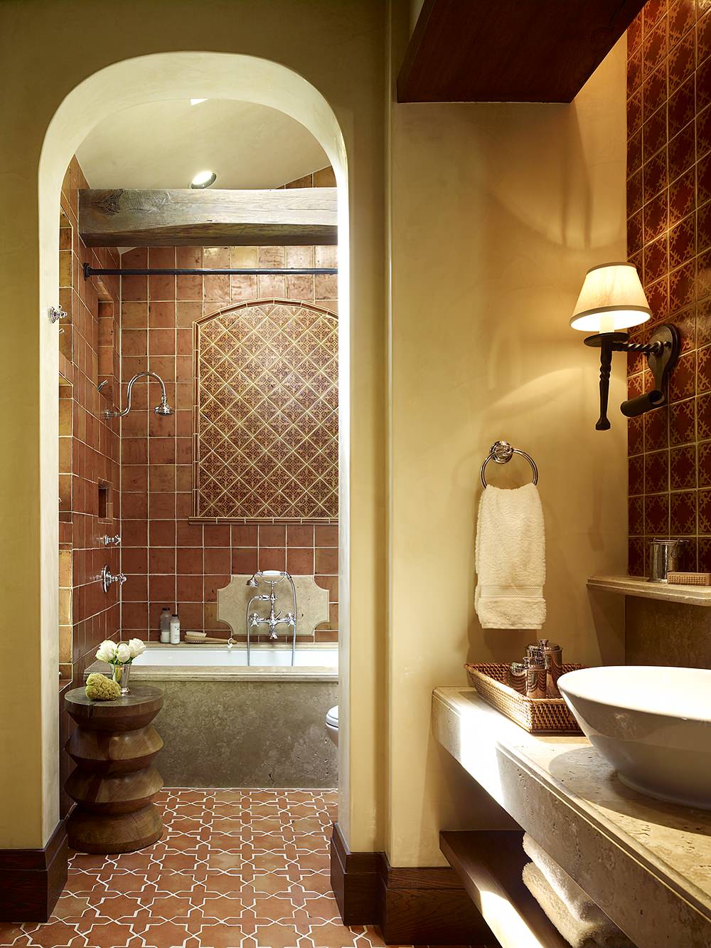 Canyon color is a made-up term I use to describe terra-cotta. There are so many shades of terra-cotta, I like to refer to them as canyon colors. This is the earthy side of Spanish, different from the vibrant hues seen in Mexican tiles. The effect is elegant and minimalist, especially when terra-cotta is paired with warm woods.