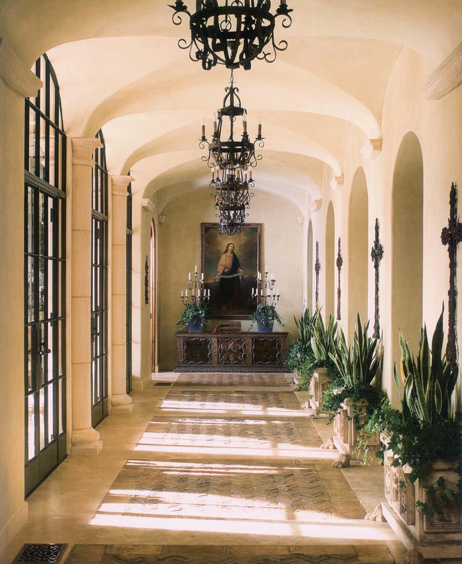 This type of vaulted ceiling, known as a "groin vault," creates a beautiful main walkway that is very typical of Spanish architecture. Notice the arched windows and iron chandeliers that further define this space as Spanish.
