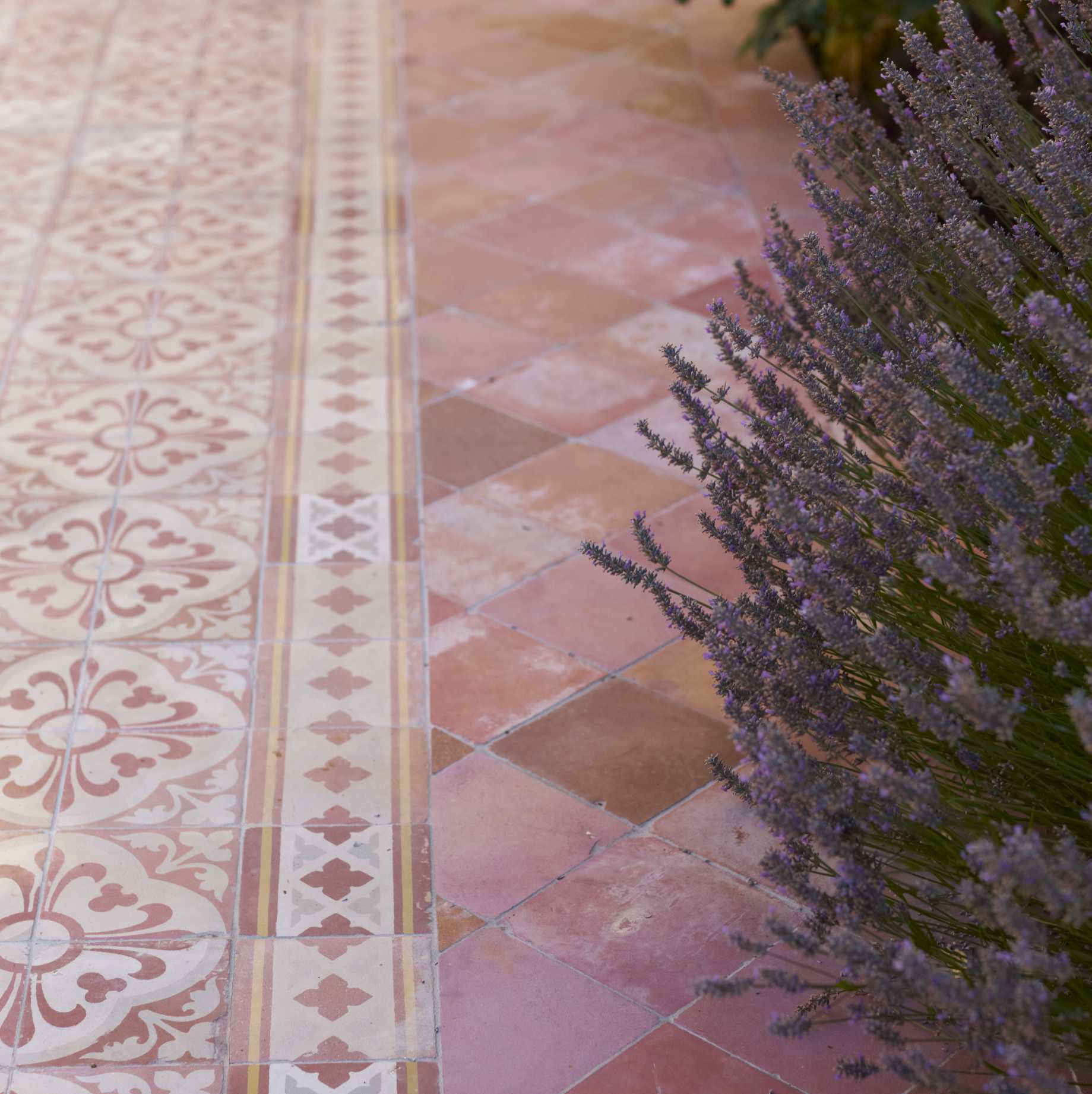 Pavers are just as beautiful for exterior applications on courtyards and patios, especially when paired with decorative Spanish tiles in earth tones.