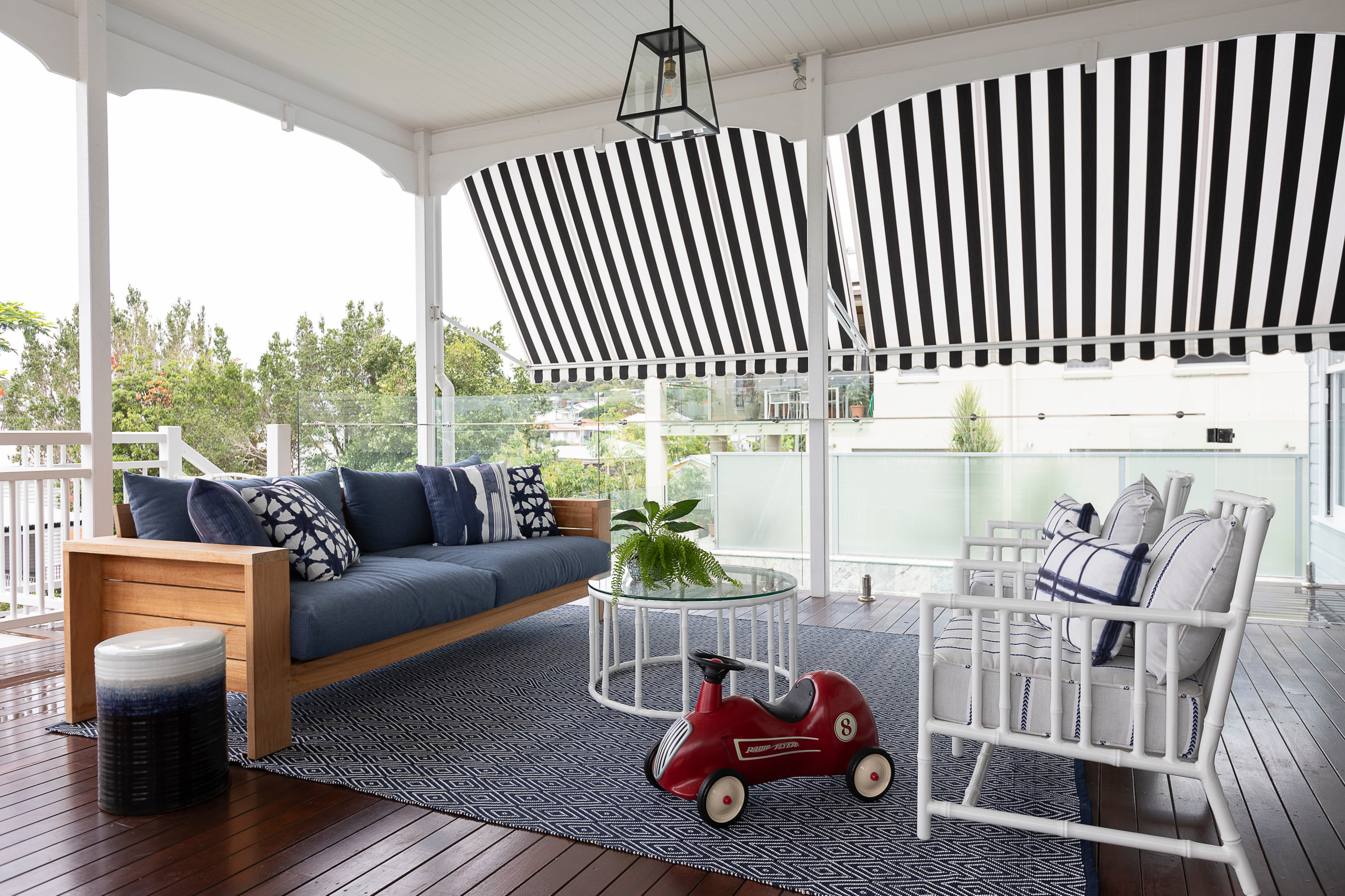 7. Put up some awnings. Awnings are a great choice for blocking direct sunlight overhead as well as late afternoon sun coming in from the side. Traditional striped versions, such as the ones seen in this Brisbane, Australia, home, pair well with a classic beach look. For a more contemporary look, choose a simple style in a bright color.