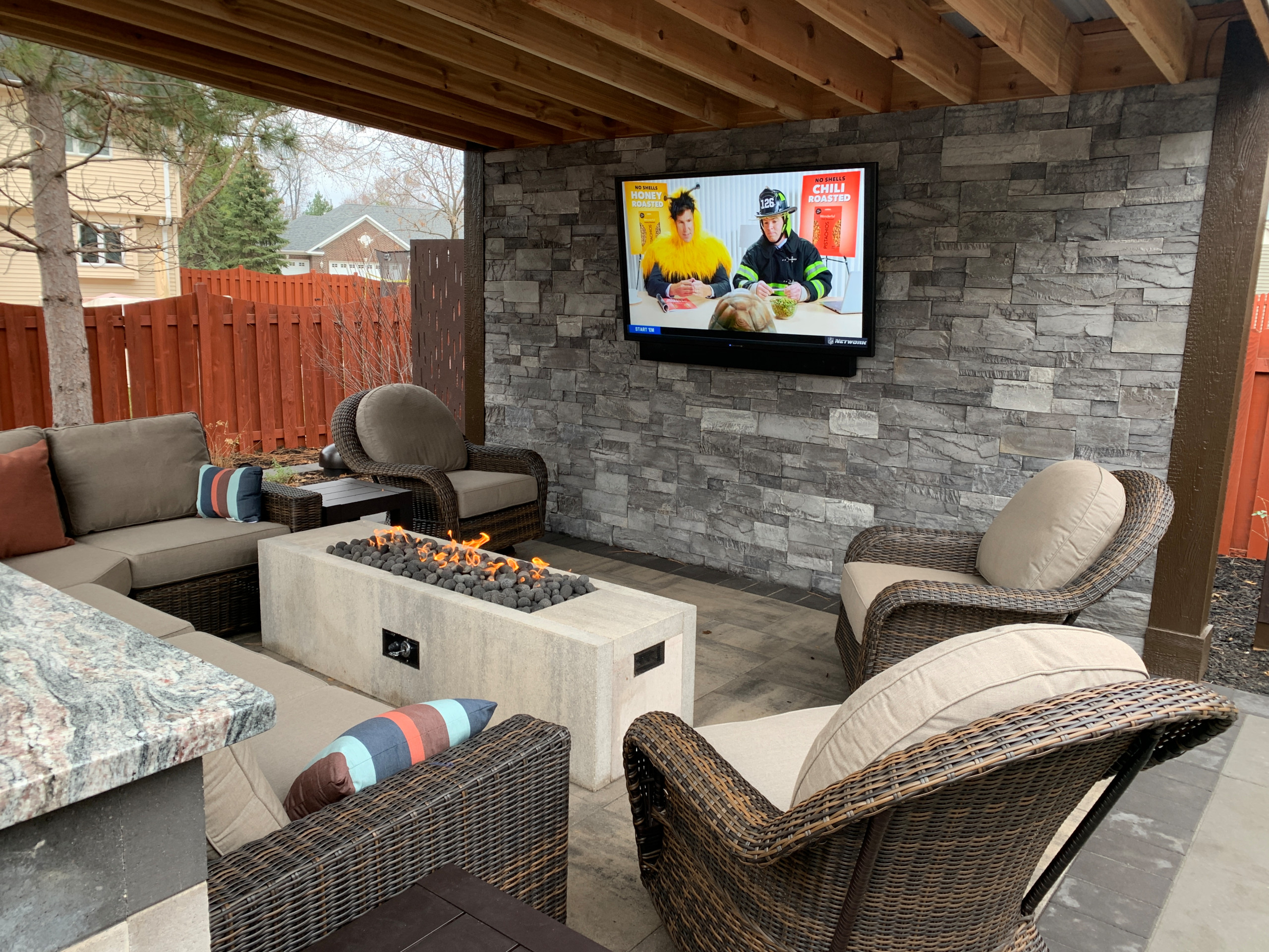 This comfy corner of a Minneapolis backyard draws family and friends outside from spring to fall. Created by The Professional Landscape, it has a stone wall anchoring one end, with a TV for watching a favorite show or sports game. A gas fire pit in the center of the space acts as both a focal point and a coffee table. A bar-level countertop, a corner of which is seen at the bottom left of this photo, is ideal for setting out appetizers, drinks and even full meals made in the outdoor kitchen just behind it.