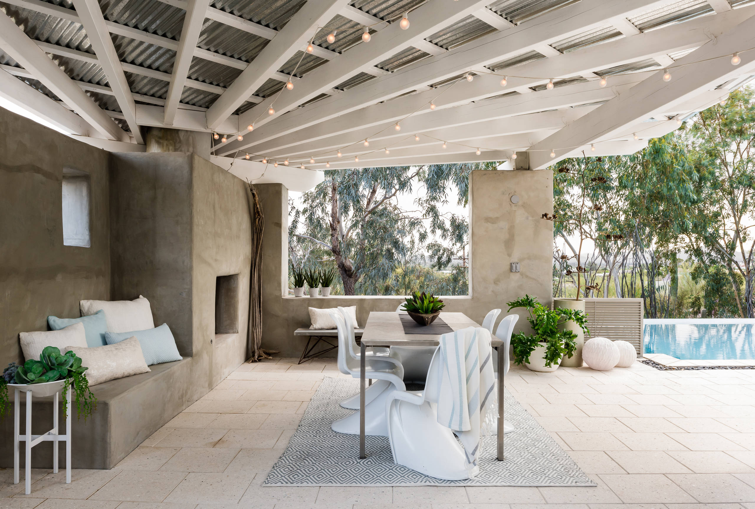 While the Southwest may be known for rich desert colors such as red and ocher, landscape designer Elizabeth Przygoda-Montgomery of Boxhill embraced a cooling, beach-inspired color palette for this Tucson, Arizona, pavilion and outdoor dining area. She designed the pavilion with an angled tin roof that provides full shade from the sun while keeping the seating area open to views and breezes. String lights overhead and a fire in the hearth create ambiance for enjoying cool desert evenings.