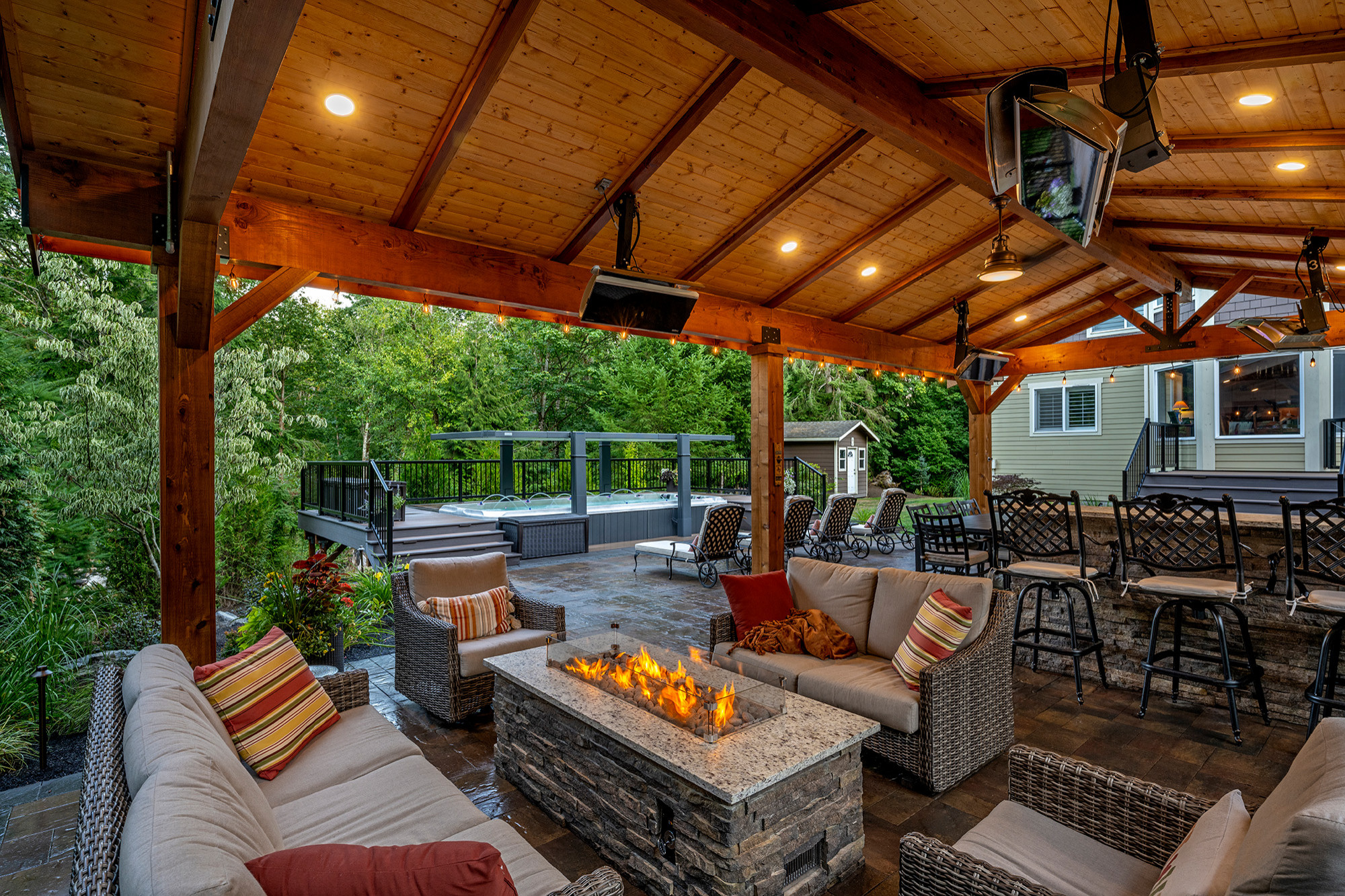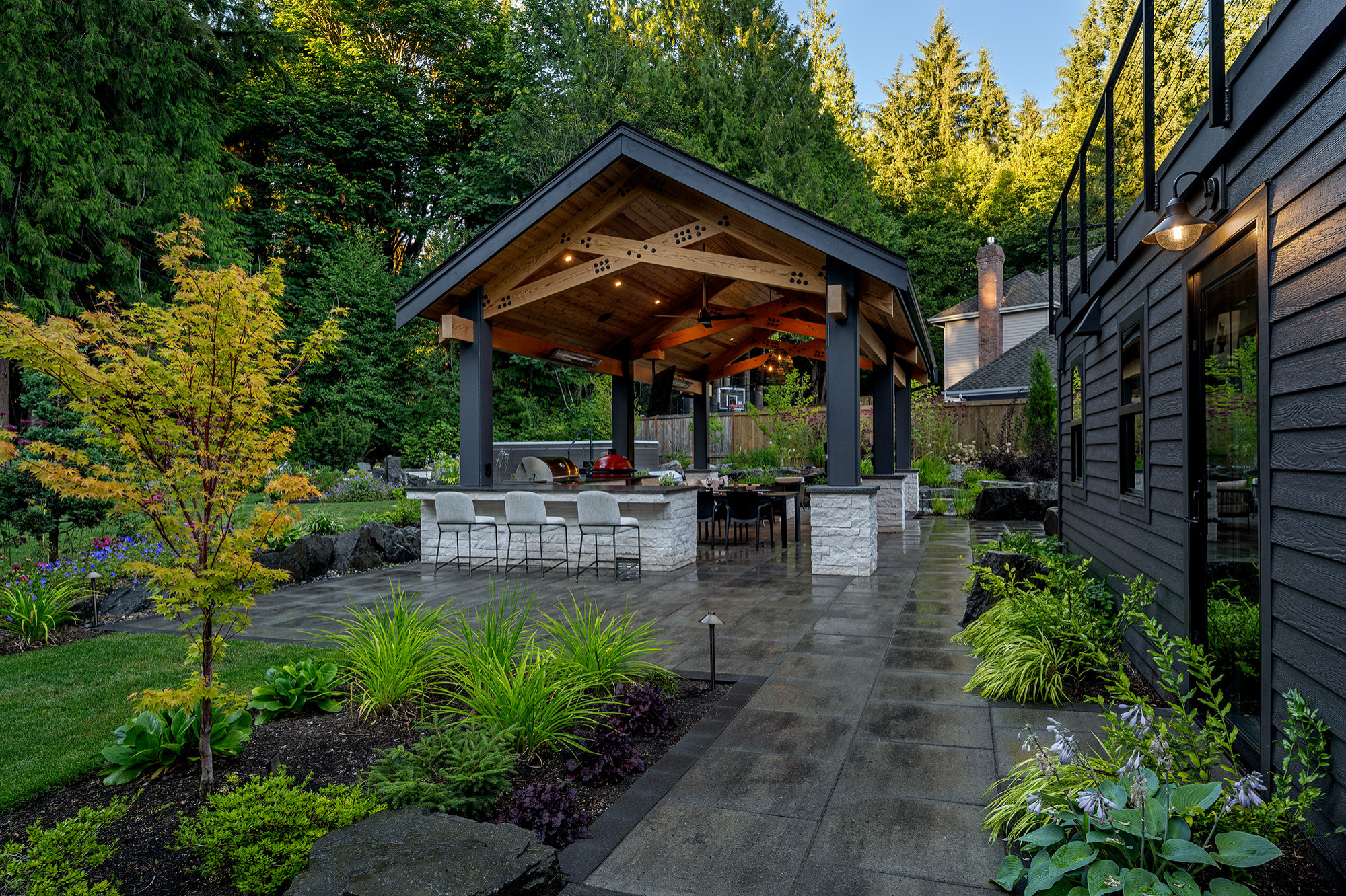 The pavilion at this home in Renton, Washington, creates plenty of room to be outside even when the weather is less than ideal. The timber-frame structure, by Alderwood Landscape Architecture and Construction, is large enough to house a spacious seating area with a fire pit as well as a full outdoor kitchen with bar-style seating. Ceiling-mounted heaters keep the seating areas feeling cozy on chilly evenings, while integrated lighting casts a soft, inviting glow.