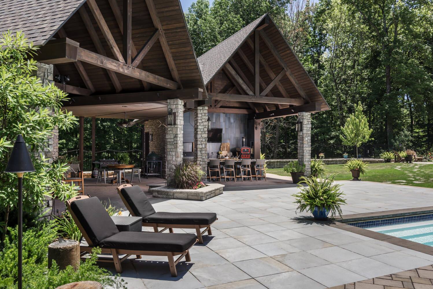 Noble Architects created two identical pavilions at this Dickson, Tennessee, home. The pavilion on the left, set at a slight angle to the pool, is meant for entertaining in all kinds of weather, thanks to its large fireplace and comfortable seating. Directly facing the pool, the pavilion on the right houses an outdoor kitchen with its own seating and a TV. Open roof ends on both structures promote air circulation on warmer days, complemented by ceiling and wall fans, while beam-mounted heaters create warmth as temperatures drop.