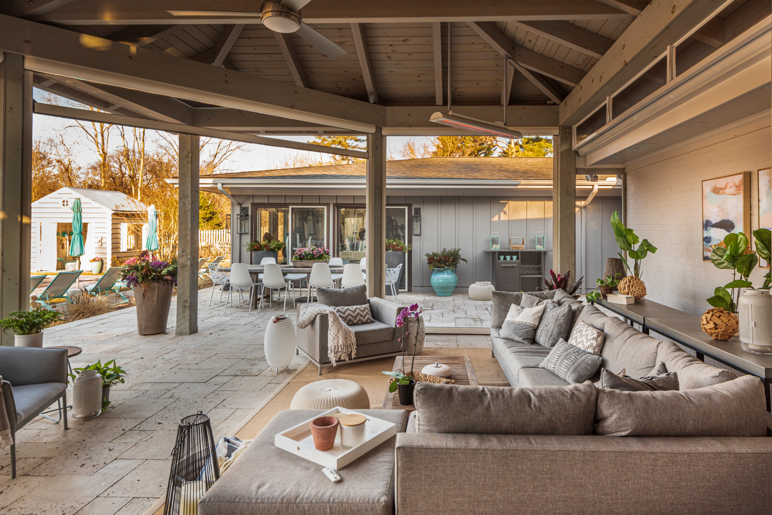 Great American Landscapes designed this expansive pavilion in Rockville, Maryland, to accommodate large family gatherings with ease. Echoing the comfort of an indoor living room, the space features plush outdoor furnishings, soft throws, an area rug and even wall-mounted artwork. Overhead heaters provide warmth during cooler months, while a nearby pool and ceiling fan offer refreshing options when summer temperatures rise.