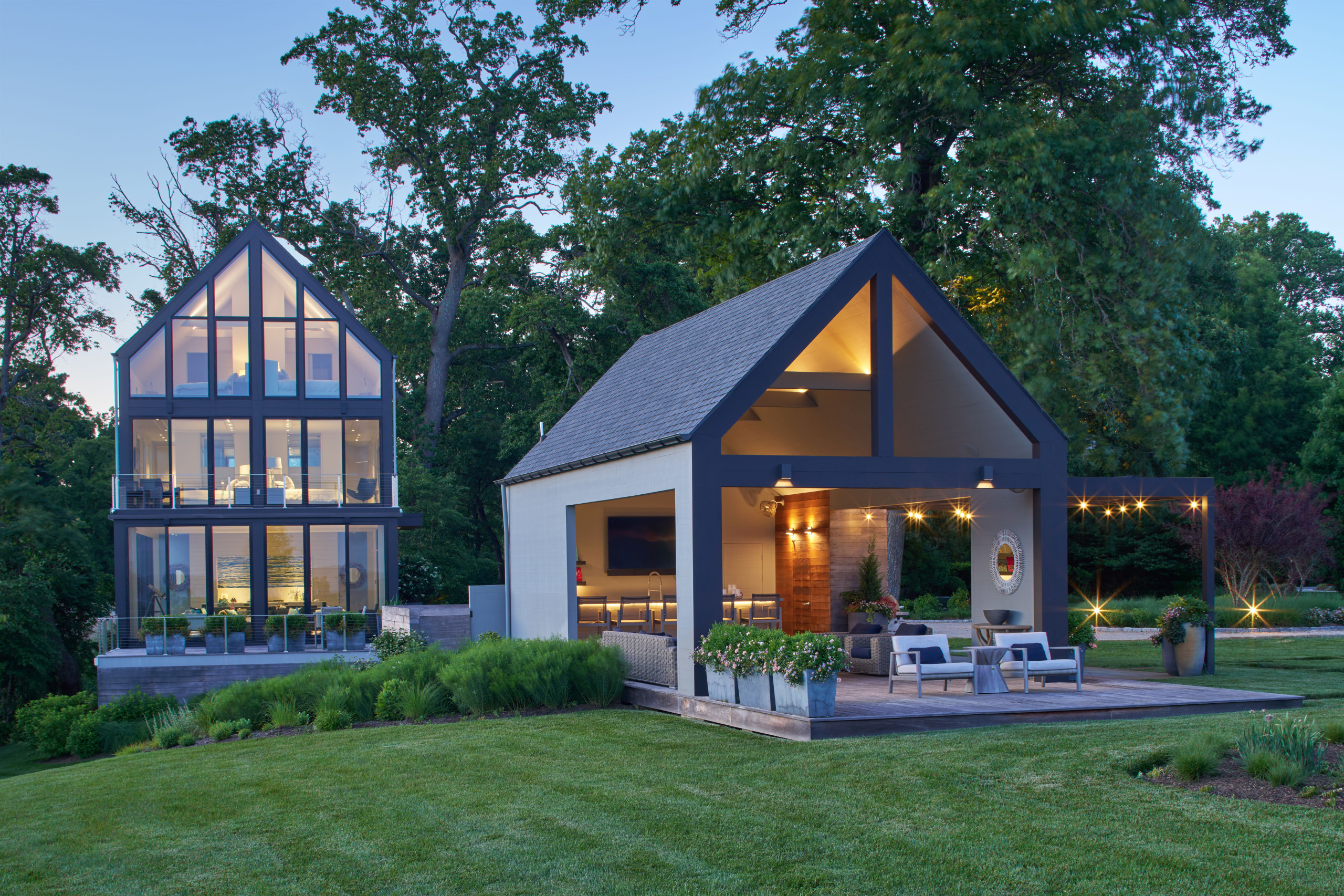 For this three-season pavilion at an Annapolis, Maryland, family home, Hansen Architects drew inspiration from the main house, echoing the architecture with a few distinctive twists. For example, the team minimized windows on the front and most of the sides, enclosing just enough space to shelter the kitchen, while a peaked roof open at one end allows breezes to flow through and provides protection from sun, rain and wind. When conditions are ideal, a pergola-covered patio on one side offers a dining area, and a large deck in front of the pavilion invites lounging and relaxation.