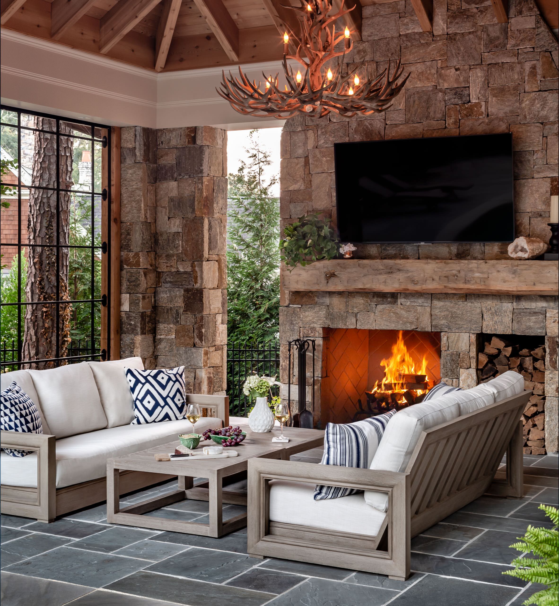 This handsome pavilion is in suburban Brookhaven, Georgia, but its stone-clad walls, antler-inspired chandelier and thick mantel with a fireplace below would be equally at home in the mountains. Soorikian Architecture used a texture-rich palette and natural materials to make the space feel warm and inviting. An outdoor bar with a sink, drinks fridge and cabinetry for storage sits to the right of the seating arrangement.