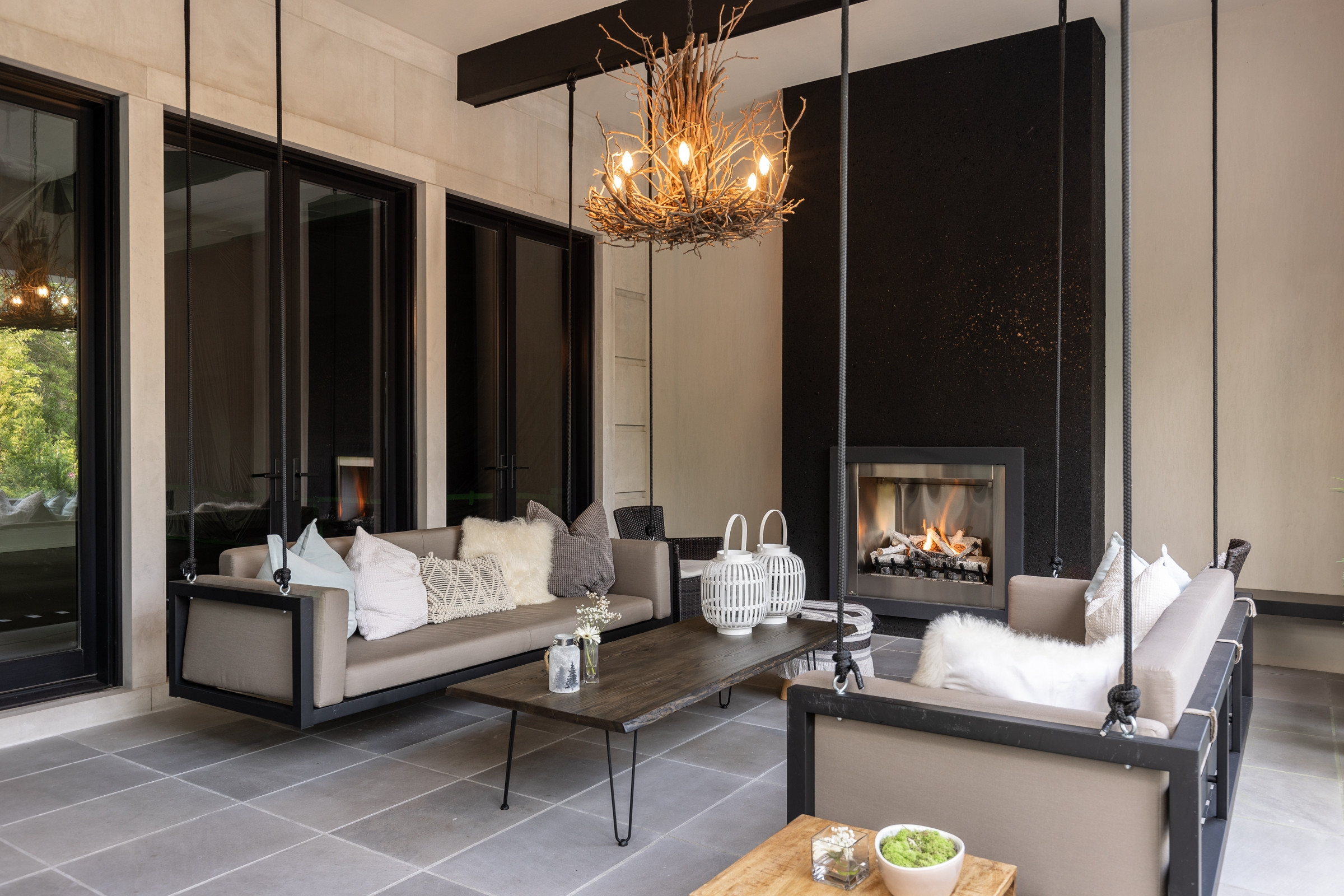 5. This Toronto covered patio by Betz Pools offers a pair of swinging outdoor sofas, a sleek gas fireplace with a bold black surround and a striking chandelier made out of tree branches.