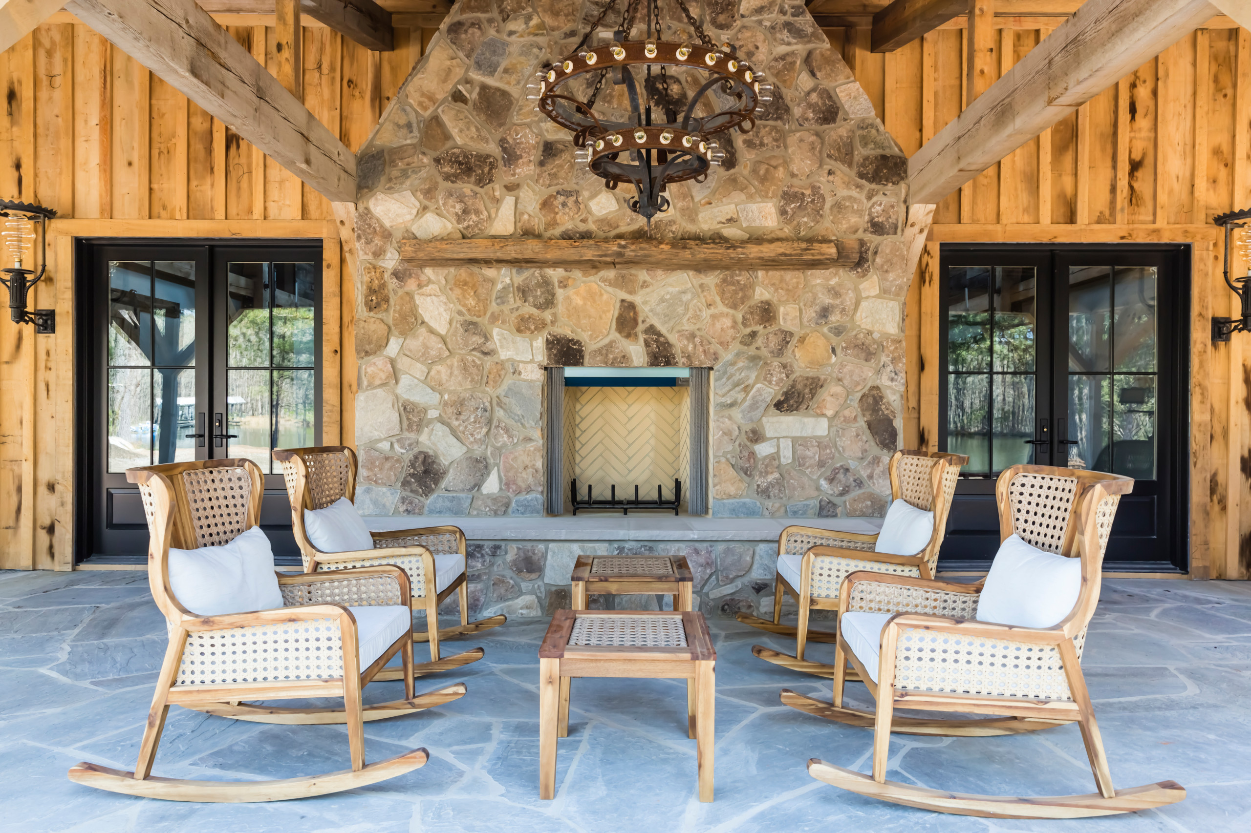 12. This rustic North Carolina covered patio by Demi Ryan Home encourages folks to pull up a rocking chair and unwind next to the massive stone fireplace. A weathered metal chandelier hung between the timber beams is another highlight.