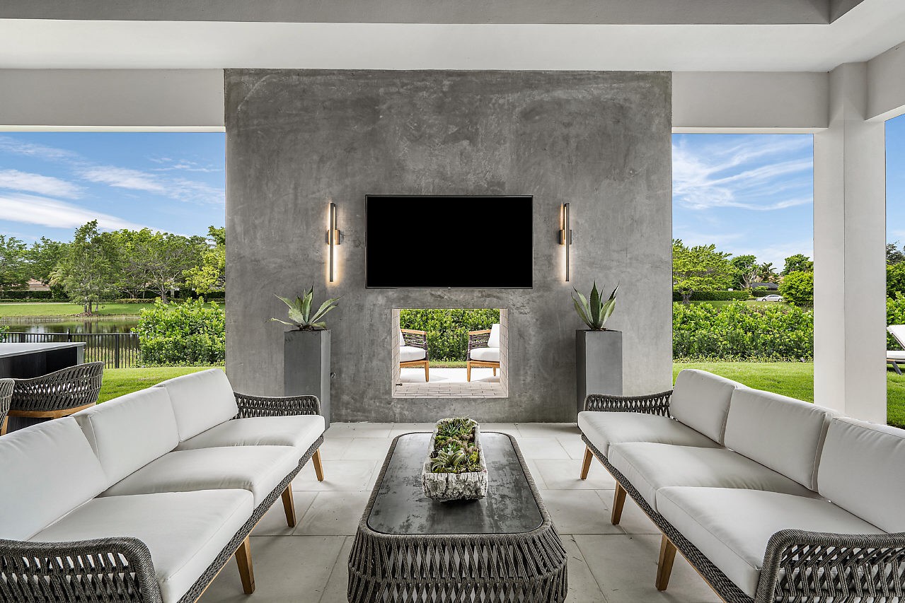 16. This double-sided concrete fireplace in Miami by HW Interiors allows the owners to enjoy a fire on the covered patio on cooler nights or under the open sky when weather permits.