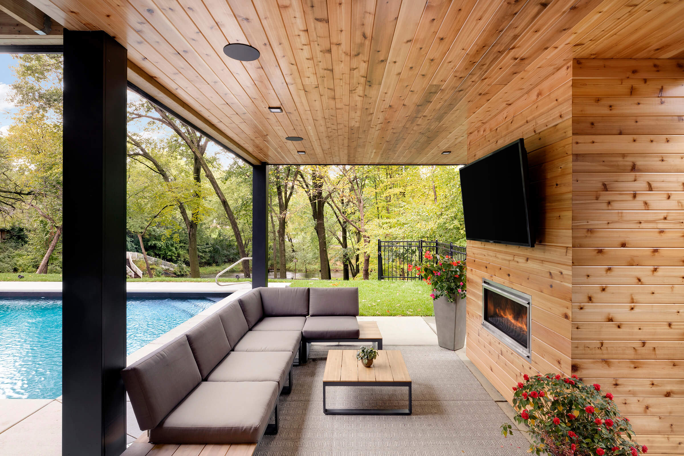 15. By using the same wood for the fireplace surround and the ceiling, Sustainable Nine Design + Build gave this Minneapolis covered patio a bold look that’s both contemporary and warm. A streamlined outdoor sectional fits neatly between a pair of posts.