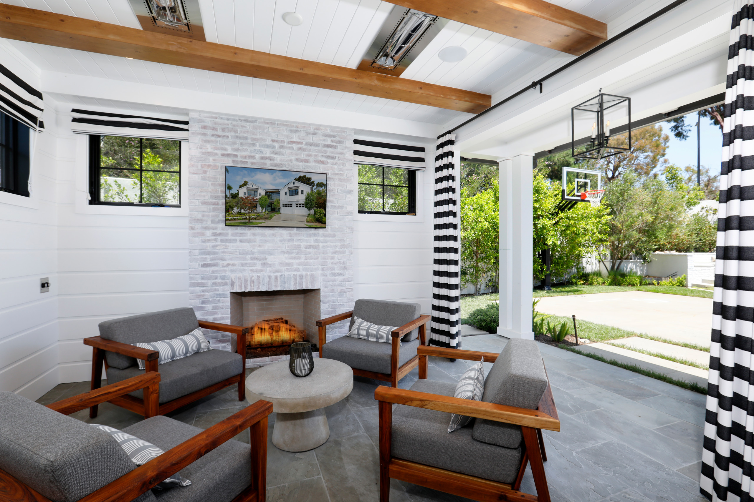 11. Black-and-white cabana-stripe curtains and window shades adds a visual pop to this Southern California covered patio shot by V.I. Photography & Design.