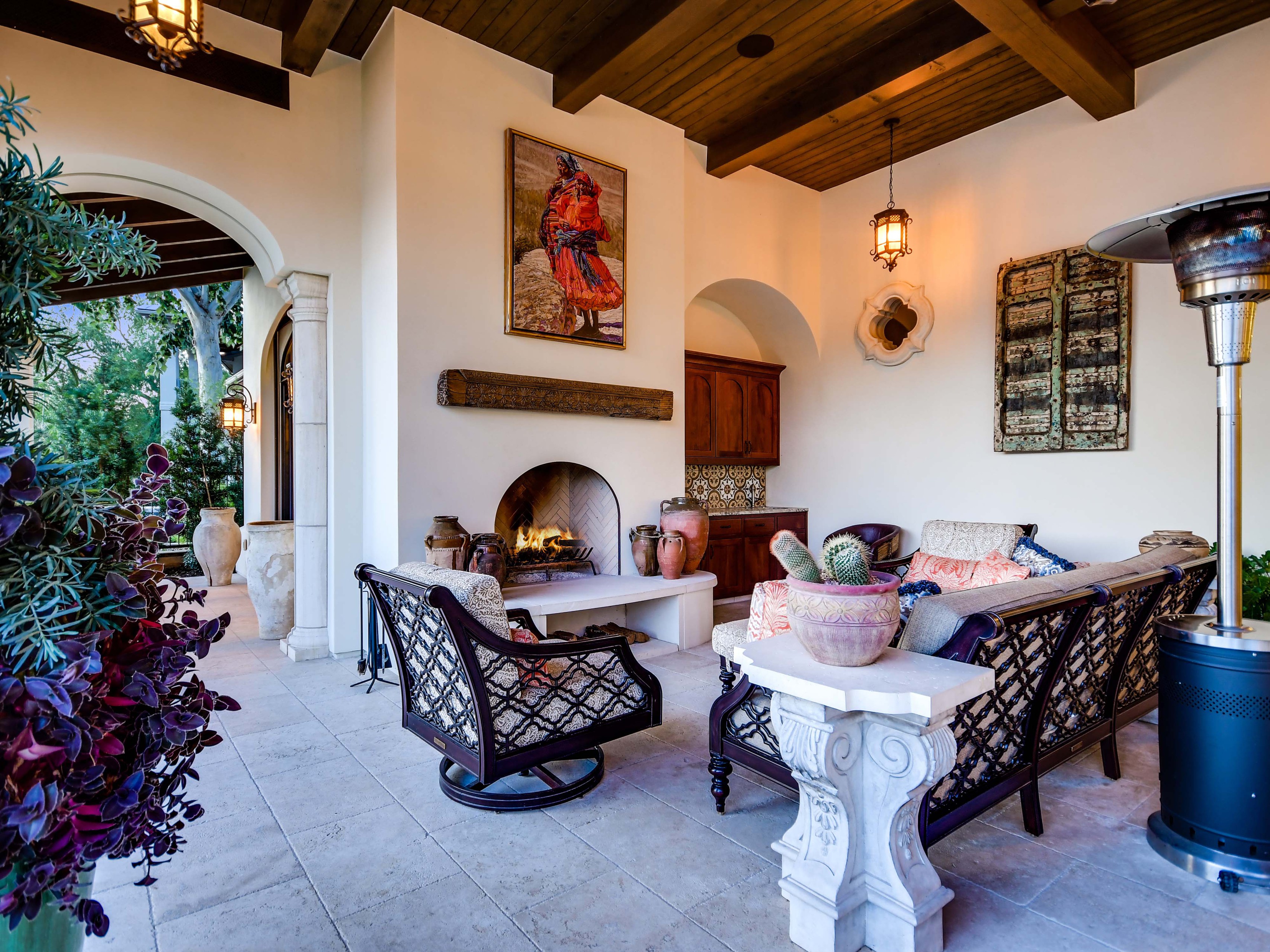 17. This hacienda-style covered patio in Austin, Texas, is by Geschke Group Architecture. It includes lantern-style light fixtures, mosaic tilework above the built-in bar and a reclaimed-wood fireplace mantel.