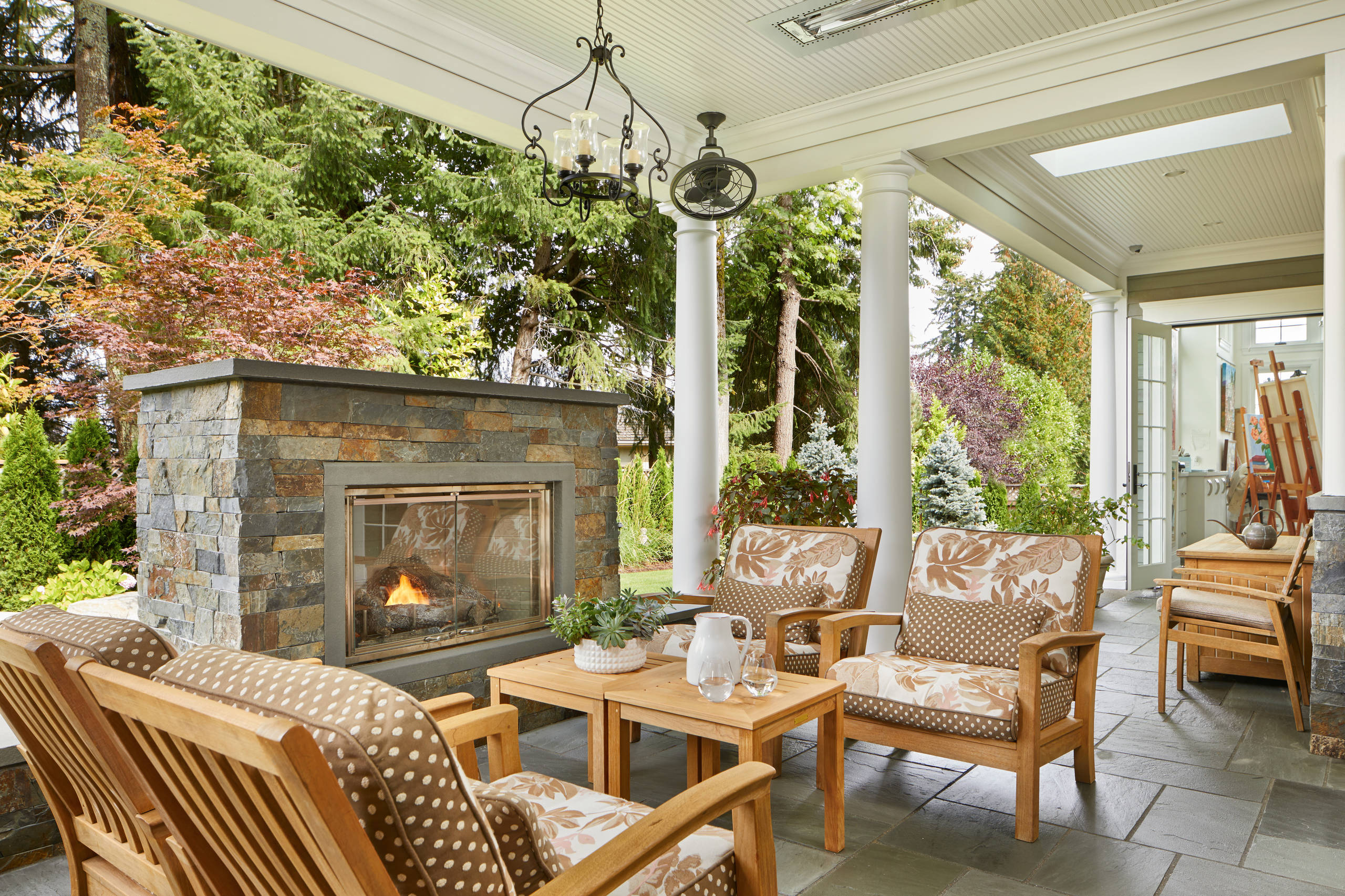 20. This classic covered patio in Montauk, New York, by Stark Construction includes a beadboard overhang with skylights, a chandelier and a fan to keep the area cool during the summer. Near the stone fireplace is a great place for warming up when temperatures drop.