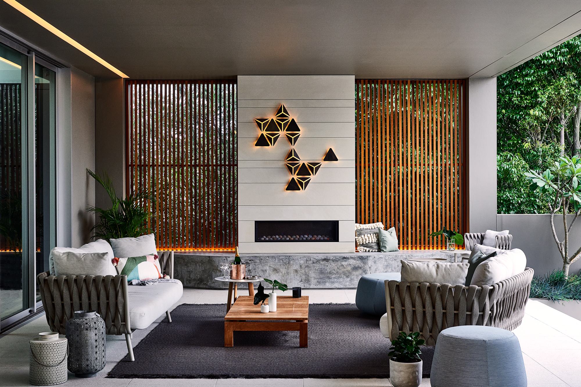 14. Vertical wood slats provide stylish privacy screening for this covered patio in Sydney by Stratti Building Group. Backlit LED art above the fireplace and contemporary outdoor furniture complete the chic scene.