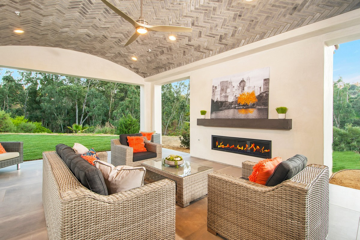 10. Gray bricks laid in a herringbone pattern add interest and texture to the ceiling in this fresh and airy covered patio in San Diego by McCullough Design Development.