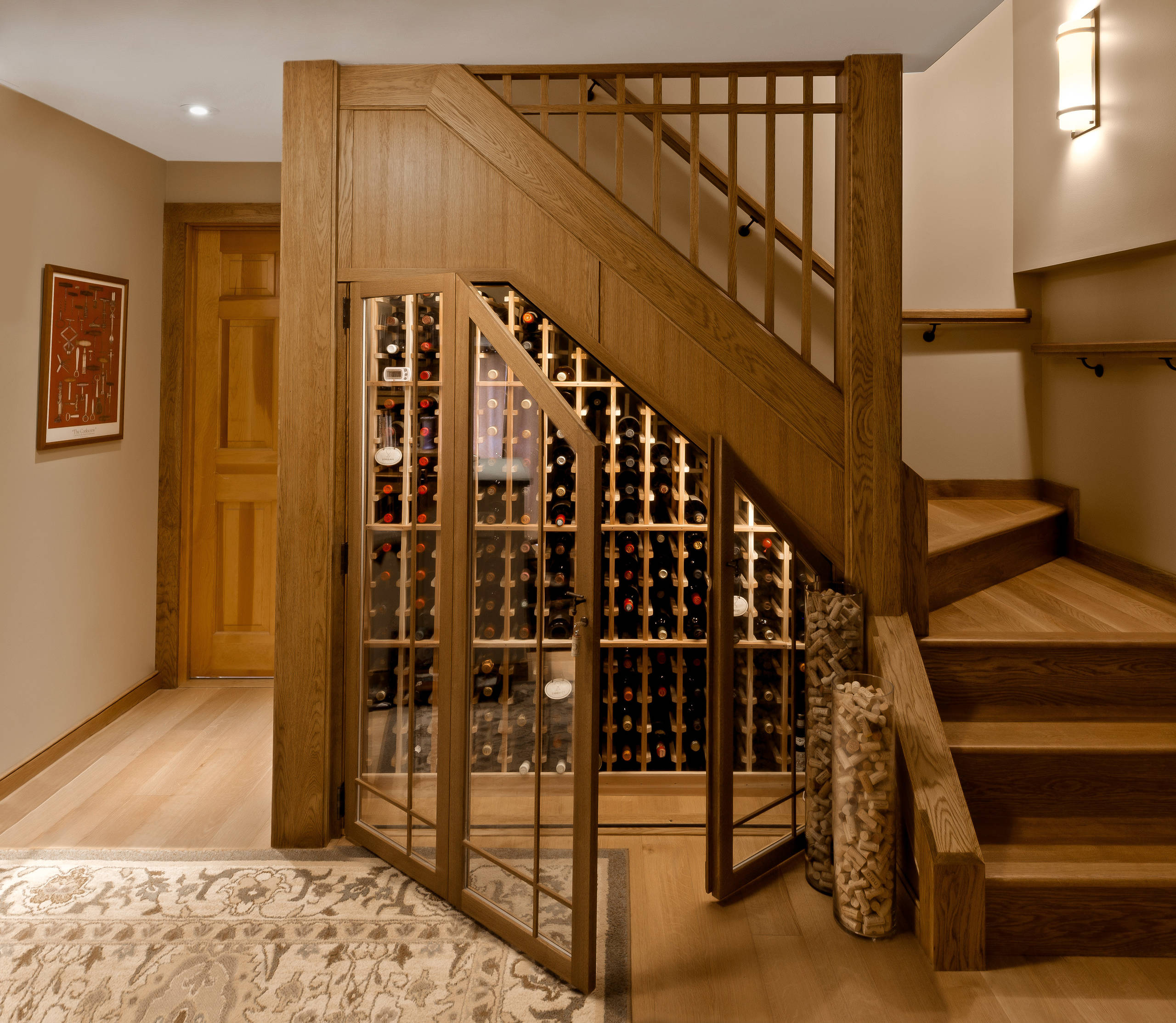 2. A wine-filled staircase is the center of the action in this circa-1900 farmhouse in Portland, Oregon. Sommi Wine Cellars custom-matched its stained cherry racking to the floor and banister.