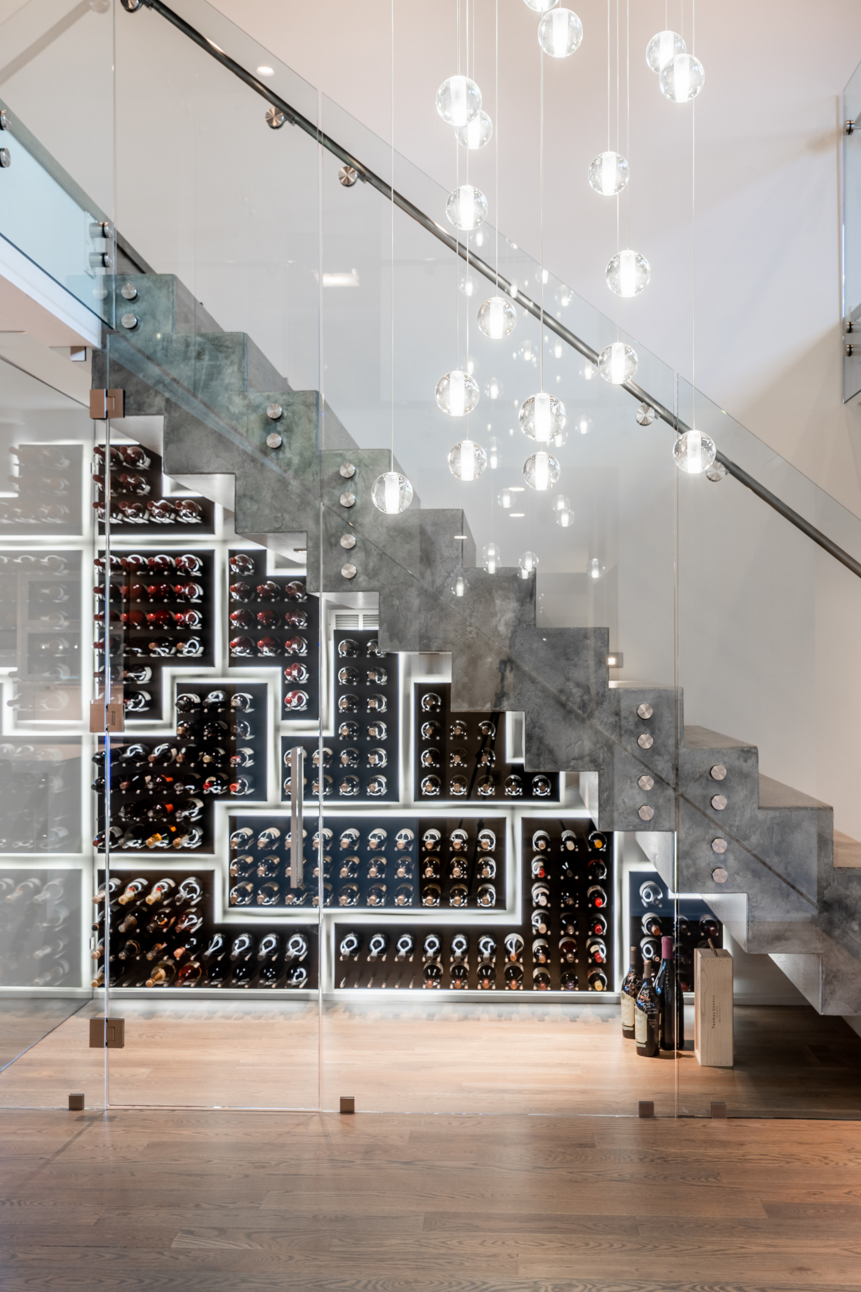 5. Puzzle-shaped racks and frameless glass doors complement a contemporary staircase built in Bozeman, Montana, by Velocity Developments and Real Estate.