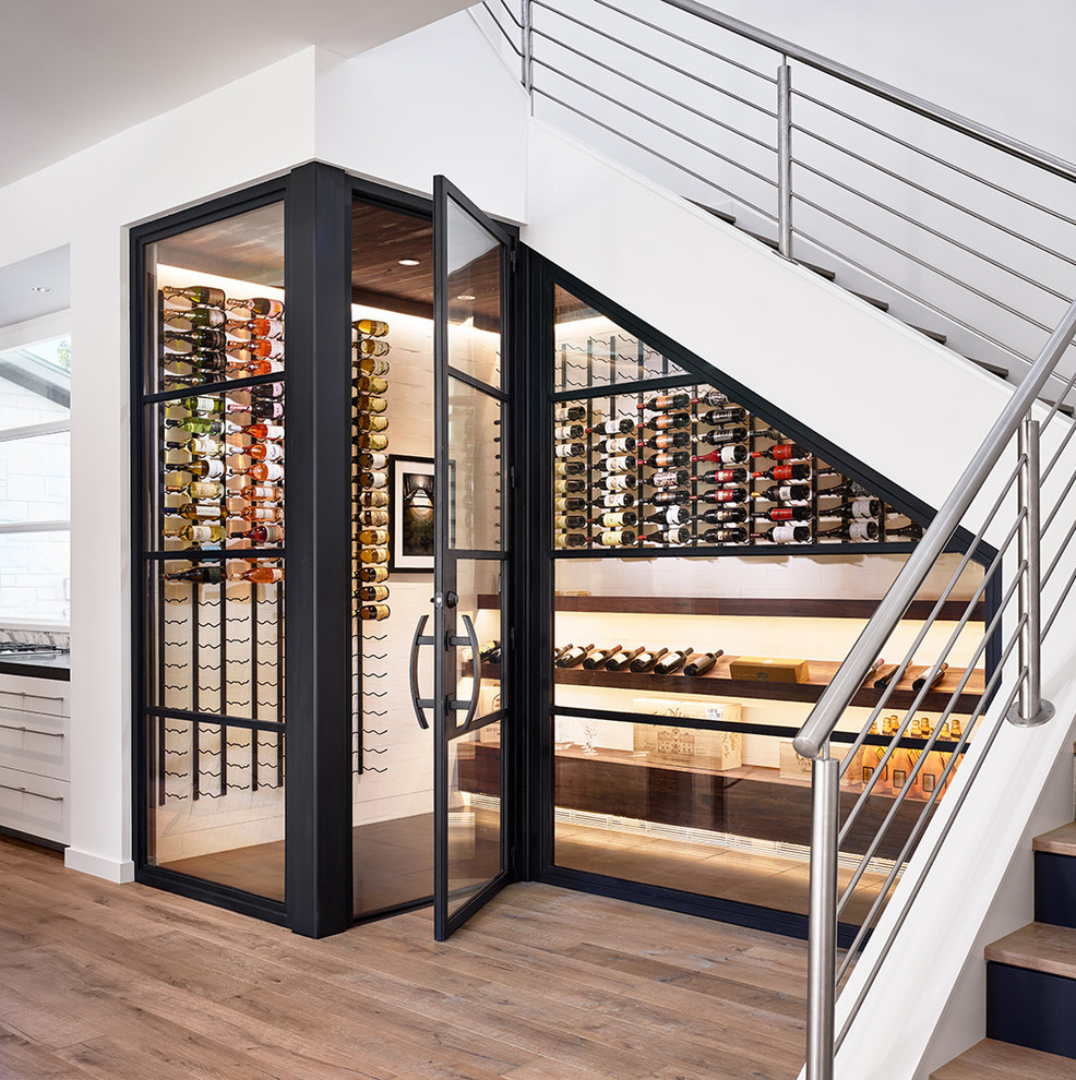 8. Eschewing an enclosure, David Watkins Home Design embraced clean lines, open spaces and cable wine racks under the steel staircase of this Denver home.