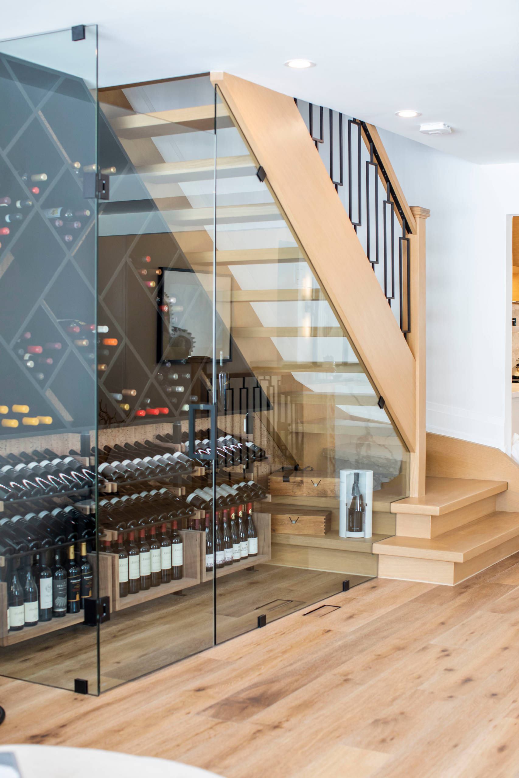 9. In a renovated Toronto bungalow, Avenue Design created an open-riser staircase that offers a fresh perspective into a glass-enclosed under-stairs wine room.