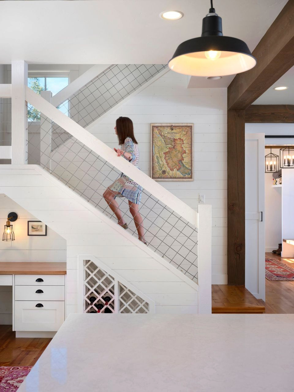 13. In a Mercè Rafecas Design Studio project in Sitges, Spain, warm-toned wooden wine racks match the flooring and stair treads and contrast crisply with white walls and a metal banister.