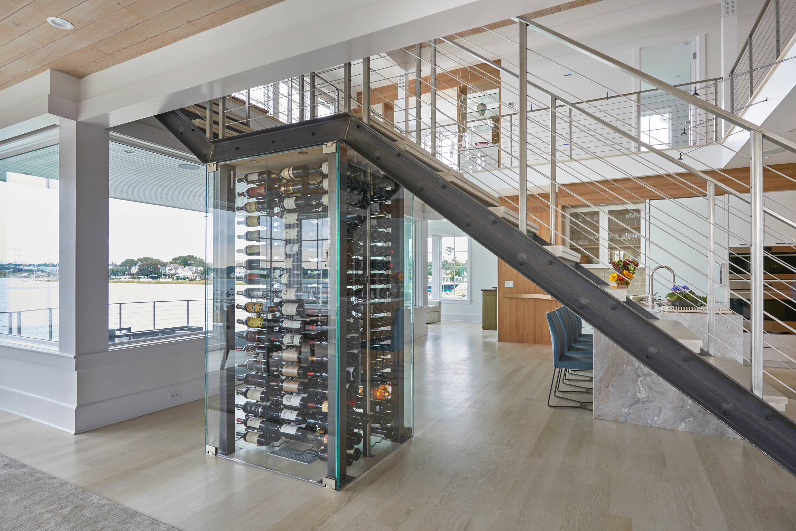 20. In a waterfront New York home, an industrial-style staircase appears to rest on a glassed-in wine-storage box.