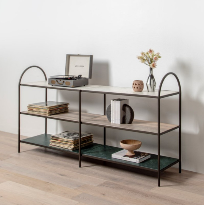 The company’s Bienna rug, seen in the first photo, takes cues from Indian carvings as well as African fringe and geometric patterns. “We’re also leaning Italian midcentury modern with a clean shape,” Dunn says. The Noel media console, seen below, exemplifies this approach, sporting arched iron frames that echo shapes of classic Italian architecture.