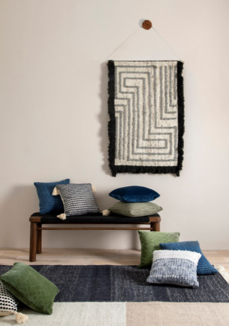 Dunn sees soft-line goods as an ideal way to play with globally inspired materials and shapes. “Buying a rug gives that look and style without too much of a commitment,” he says. “My favorite place to put color and texture is on the floor. It’s the easiest way to pull a room together, and helps tell the story.” He blends seagrass, natural wovens and velvets for visual interest, incorporating block printing, exaggerated fringe and repetitive geometric shapes.