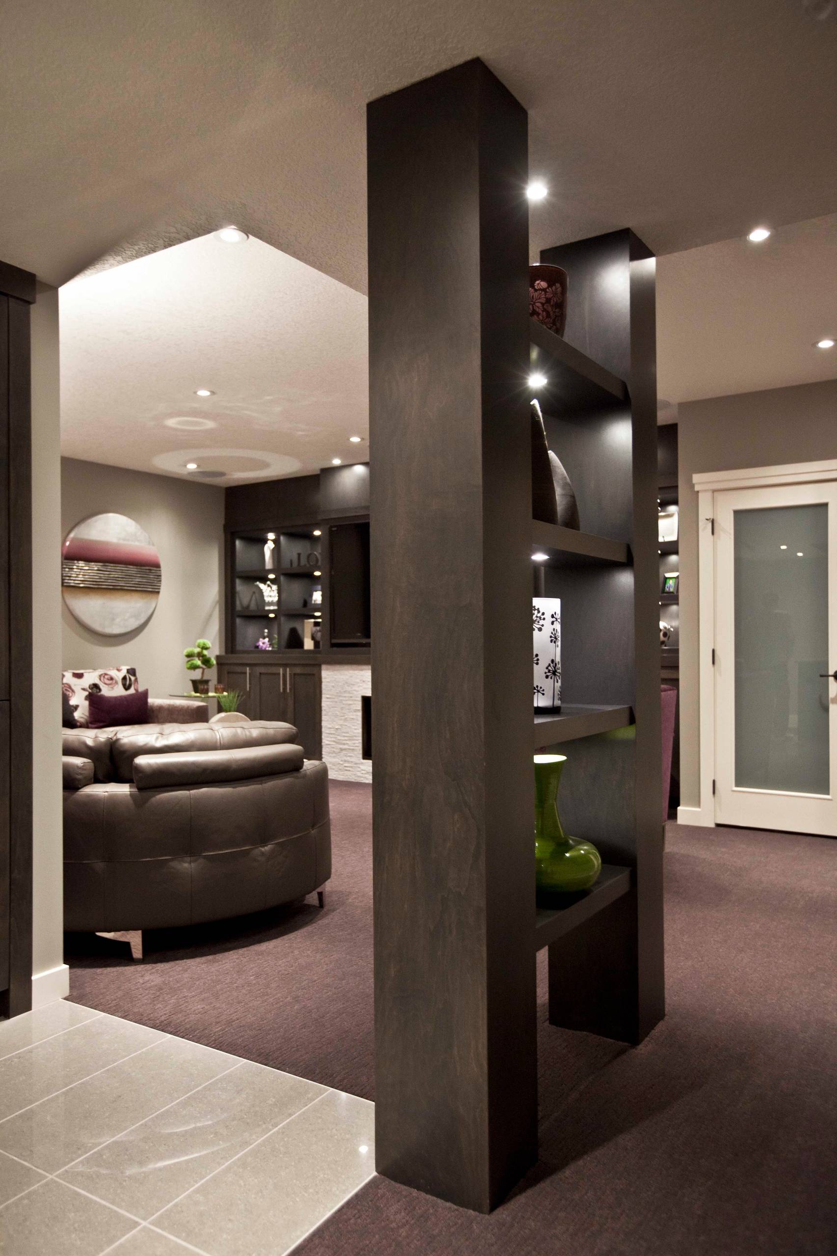 Turn it into a media center. Not sure where to place your TV in your big, beautiful open floor plan? Why not turn your structural column into a media center? Even if you don’t place the TV there right away, it could be smart planning to allow for electrical outlets near the column.