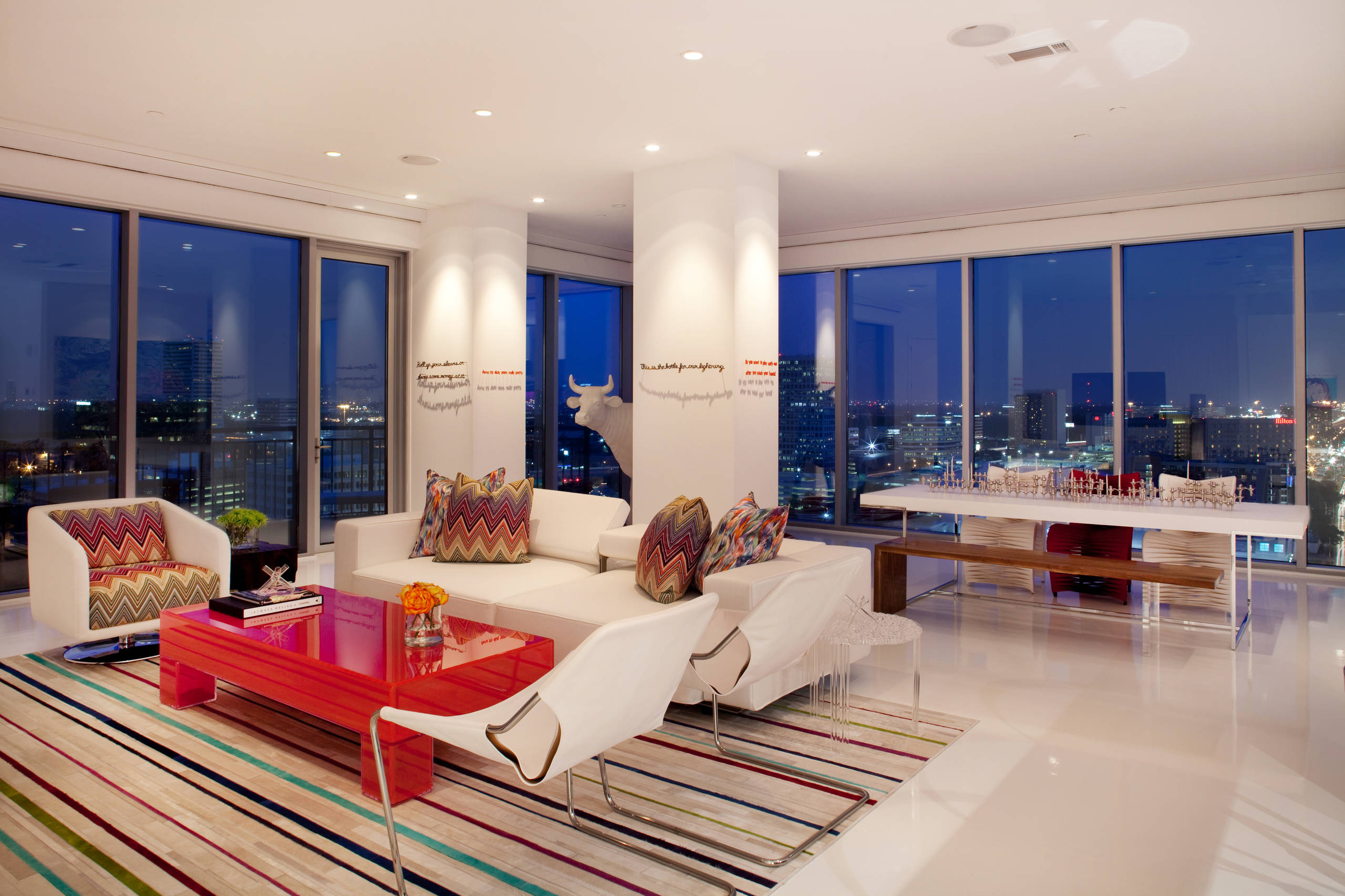 Display art on your columns. These large white columns are acting as blank canvases for floating typographic artwork. The downlights cast shadows on the columns, making the artwork even more noticeable.