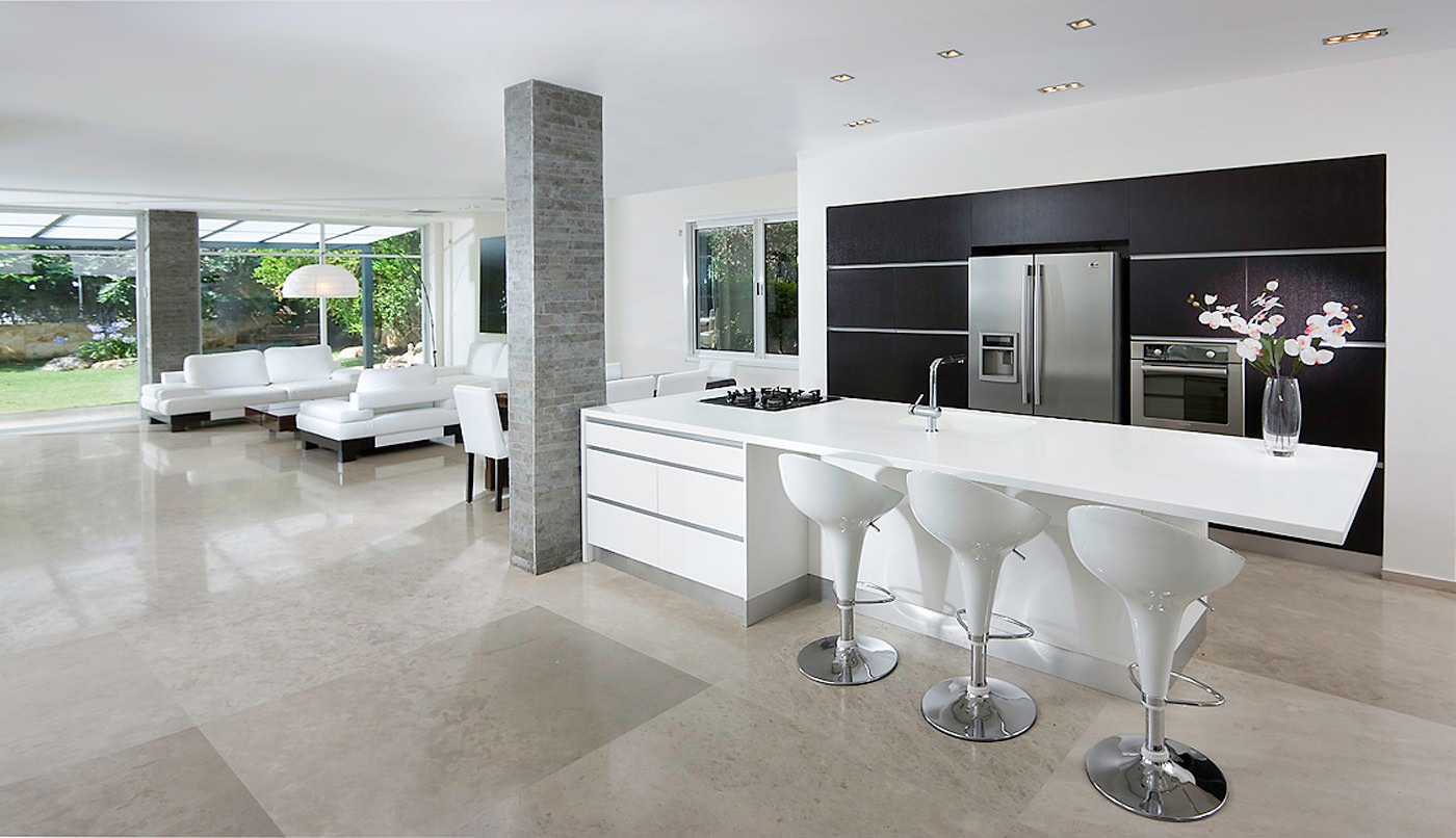 Create custom furniture. This bar stretches between two columns to nicely frame the kitchen while providing vertical and horizontal storage space.