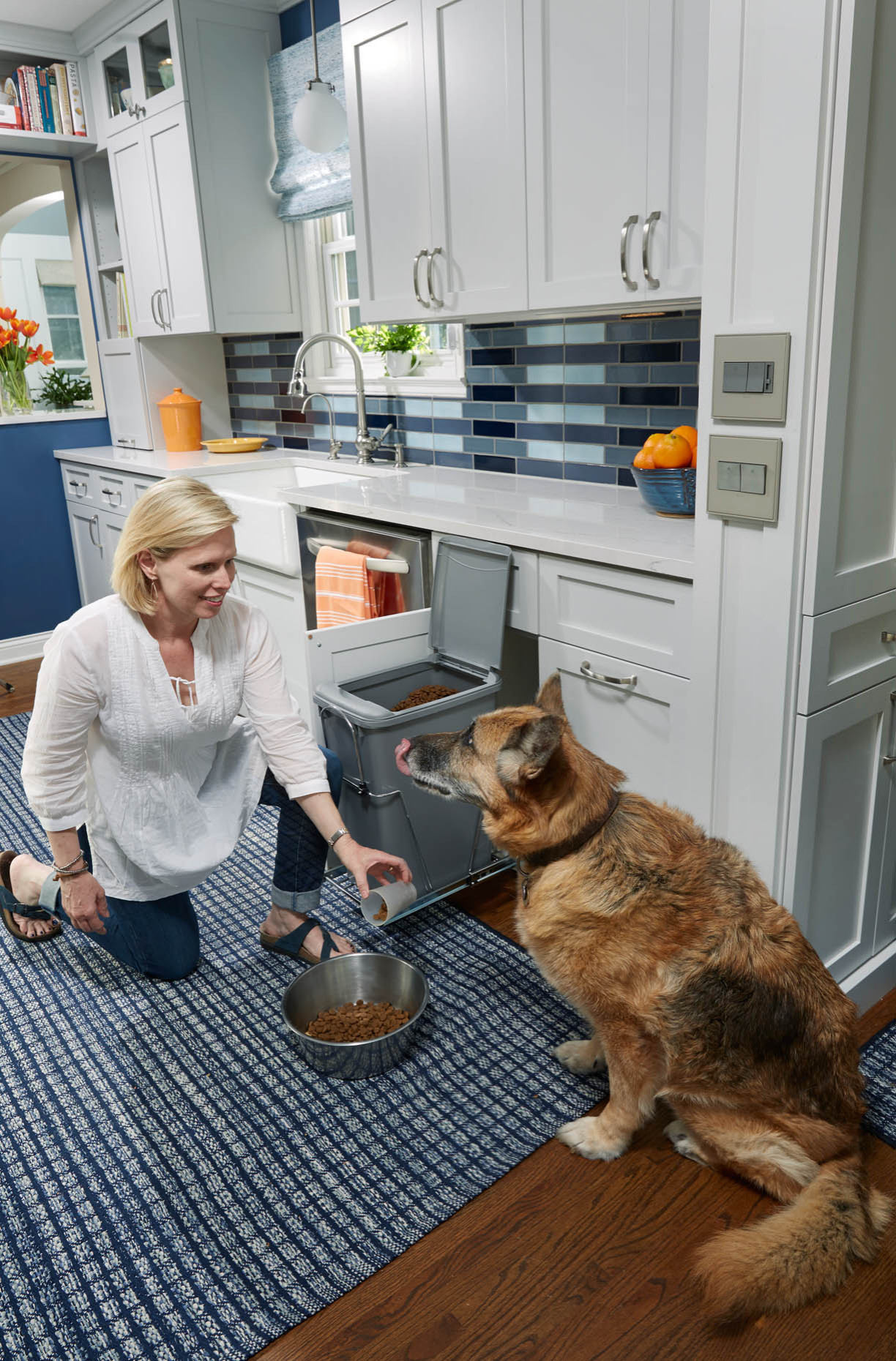 LiLu Interiors used what looks like a simple pullout for a trash can to create a dog food station in this St. Paul, Minnesota, kitchen.