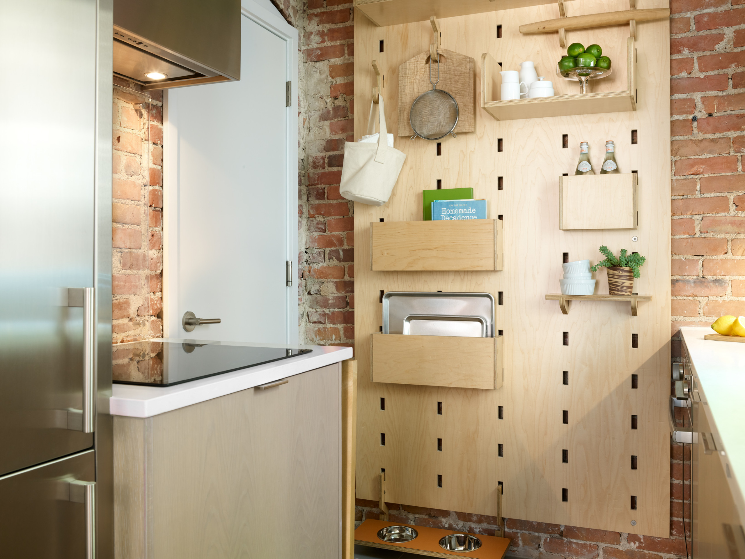 Eric Wilson — Renovation & Remodeling carved out flexible storage space from a teeny-tiny Cambridge, Massachusetts, kitchen by installing a Kerf Design wall unit that’s like an oversize version of Julia Child’s famous kitchen pegboard.