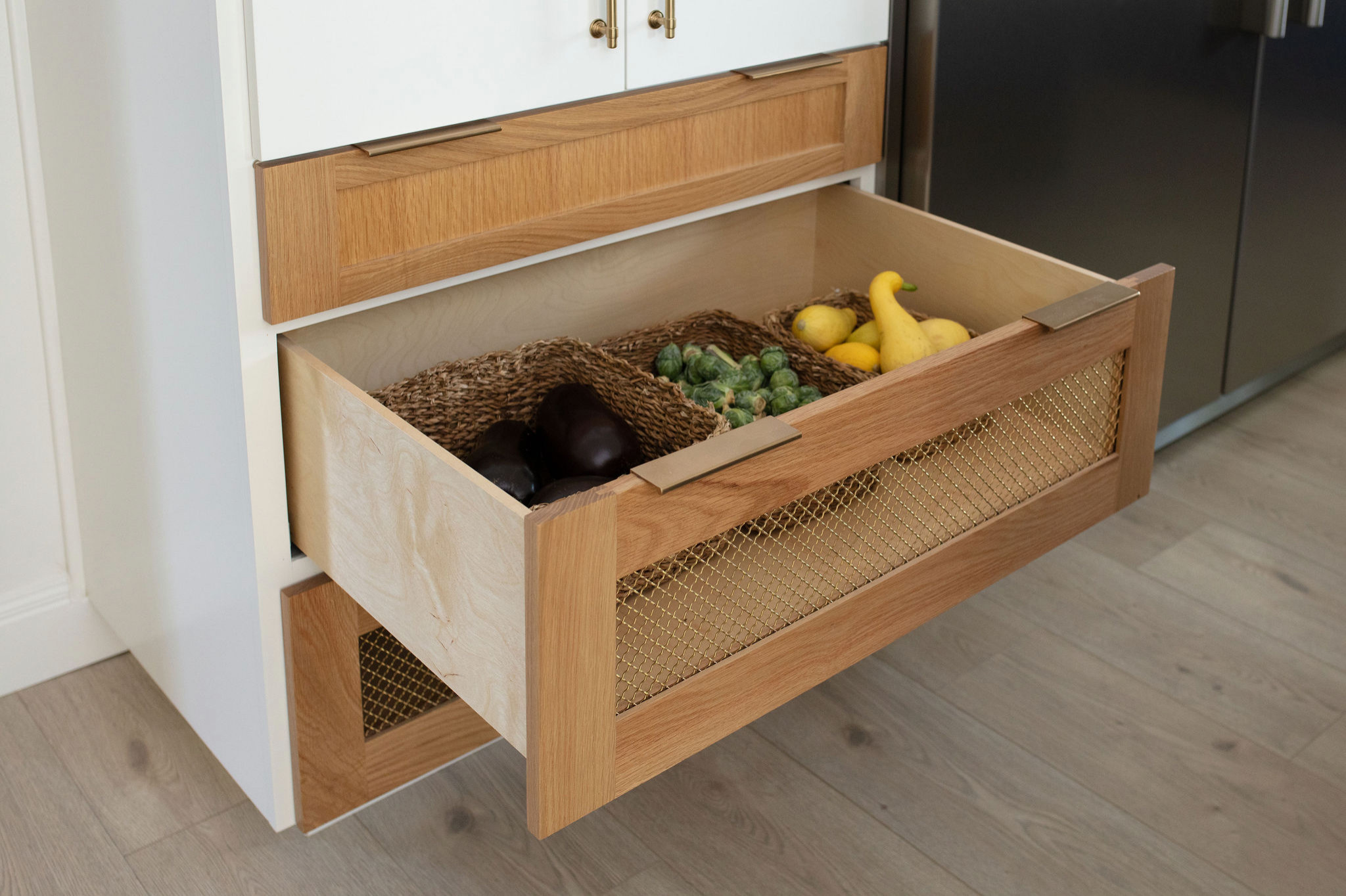 Some vegetables and fruits are best stored in airy baskets at room temperature rather than in a refrigerator. In this Houston-area kitchen by Jennifer Kizzee Design, a basic drawer with basket inserts and a wire mesh panel front serves the purpose with little custom woodworking required.