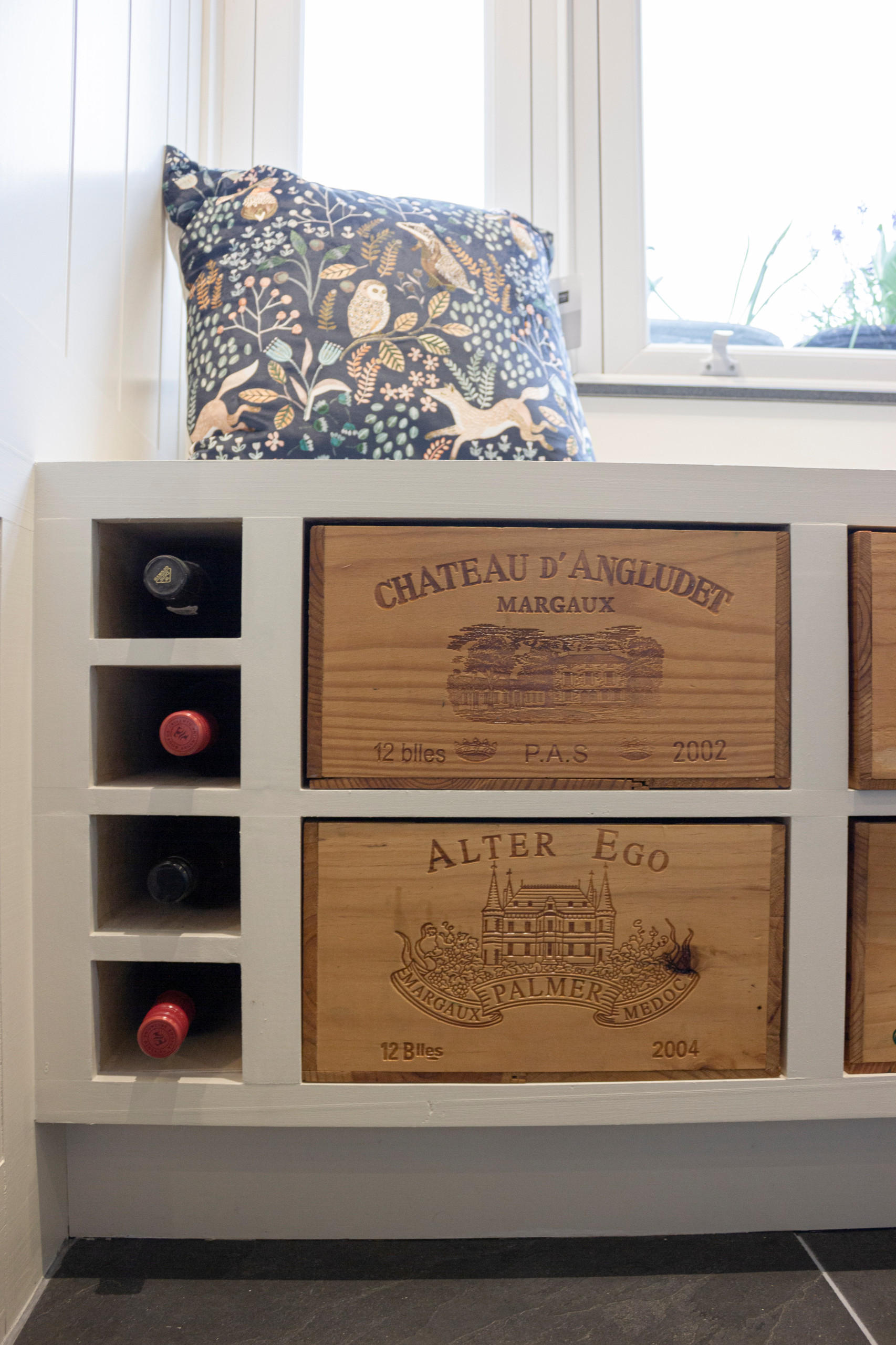 A bench in another English kitchen — this one by Lucie Bonney Design — uses wine crates for drawers alongside vertical cubbies, adding panache to the design.