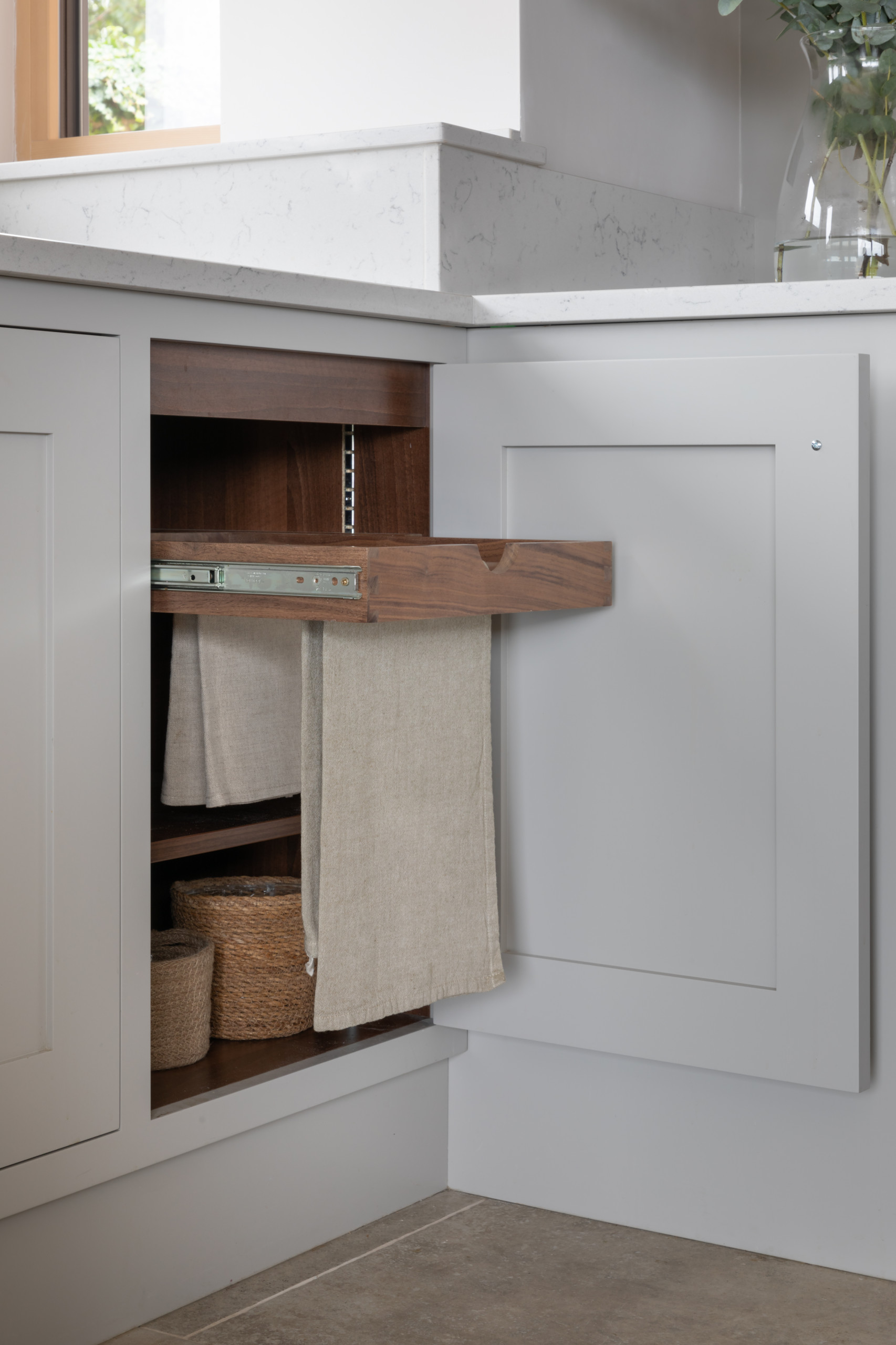 This English kitchen by Krantz Designs is full of fun features built into its soft gray and American walnut cabinetry, including this pullout rack for hanging dish towels.