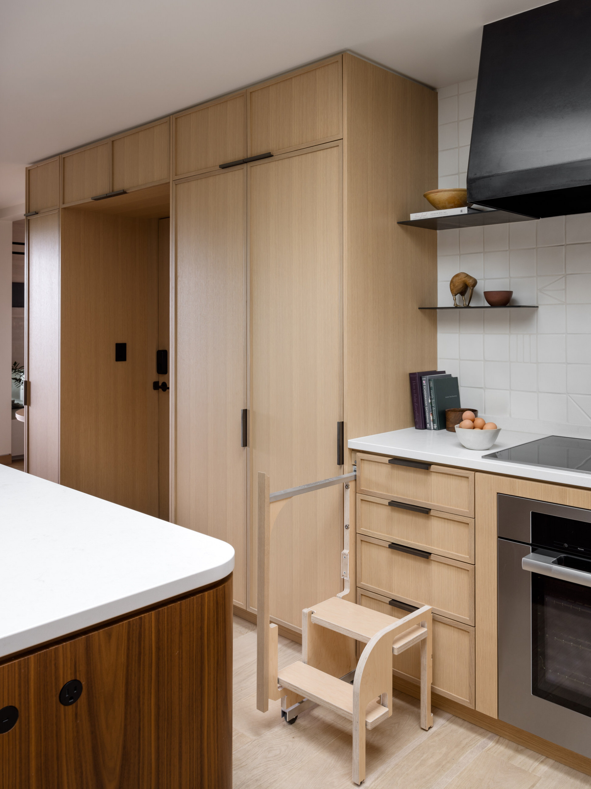 Alternatively, a mere 1½-inch gap between cabinets can accommodate a folding step stool like the one in this Portland, Oregon, kitchen by Guggenheim Architecture + Design Studio.