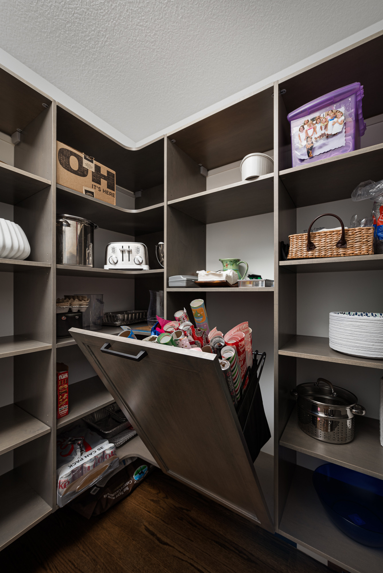 All kinds of household products tend to get stashed in kitchen pantries, including wrapping paper. In this Illinois pantry, Riverton Cabinet used what looks like a tilt-out cabinet for trash cans to keep the rolls under control.