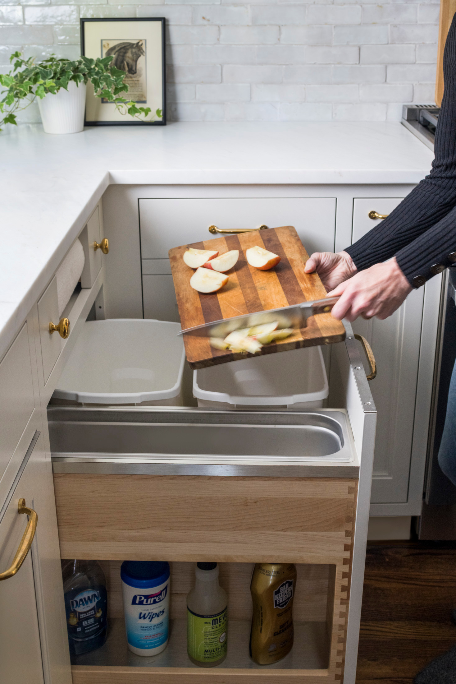 Here’s an example of an integrated cutting board on drawer slides, which is designed so food scraps can be pushed through a hole into a compost or trash can below.