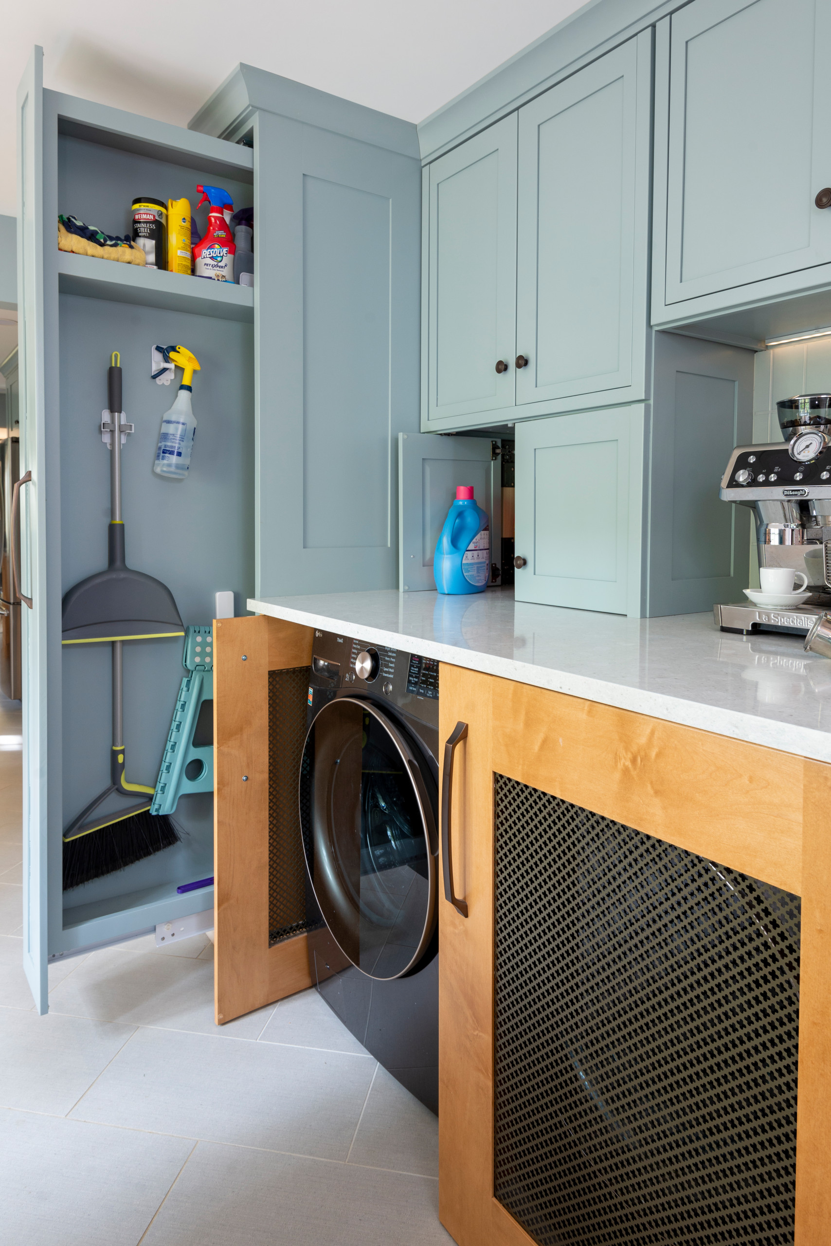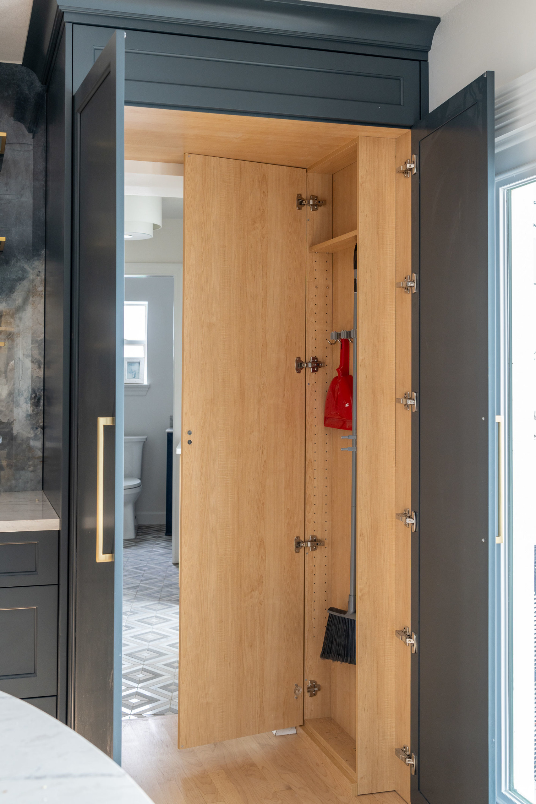 In this Florida kitchen by One Piece at a Time Design, what appears to be a tall pantry cabinet opens to reveal a pass-through to a laundry room. And inside the passageway is another secret door, this one concealing a shallow cabinet for brooms and other supplies.