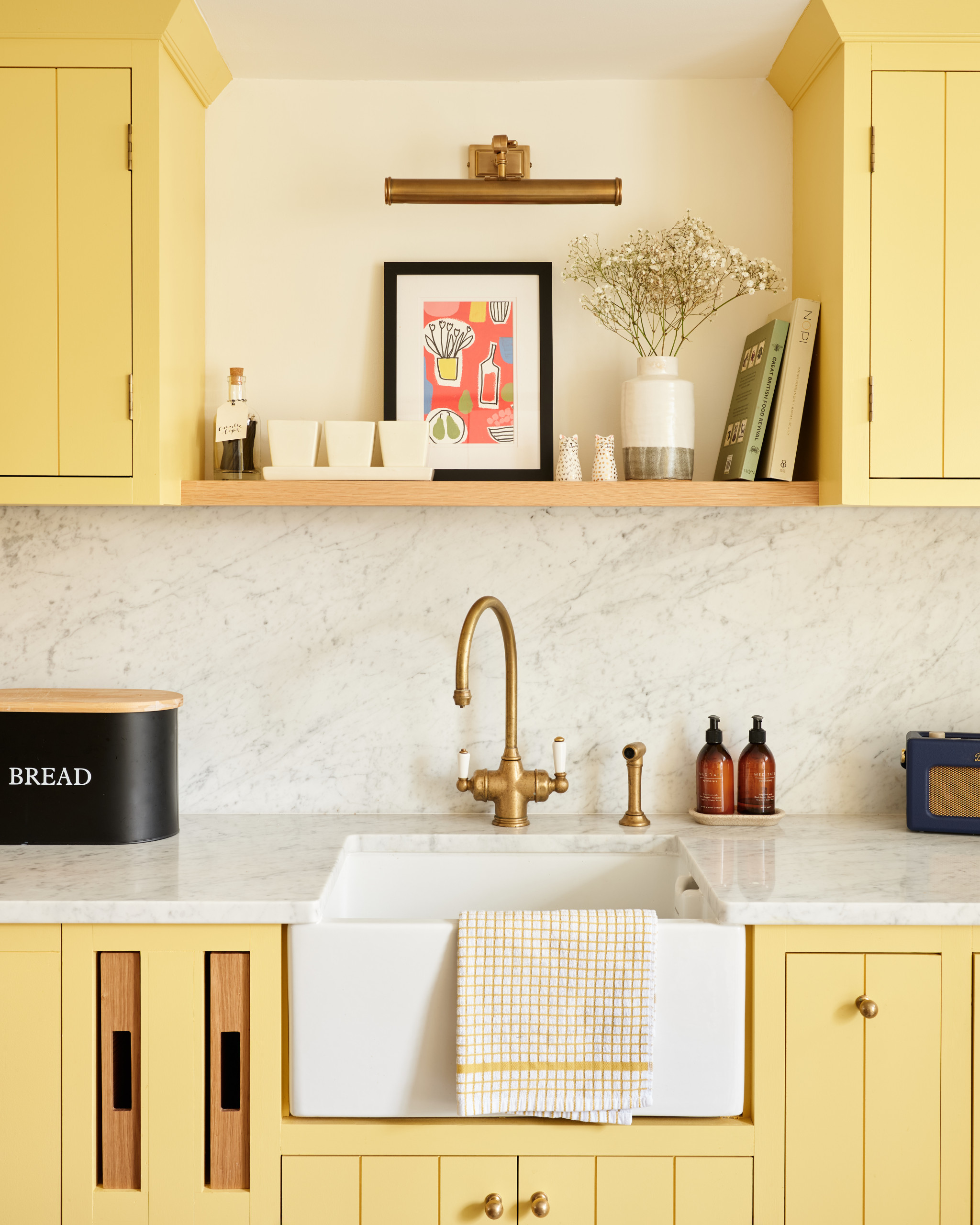 In the cheerful yellow kitchen of her Georgian townhouse, British designer Josie Lywood of Q Design House has what appear to be slide-out removable trays or cutting boards stored in vertical slots in the custom cabinetry.